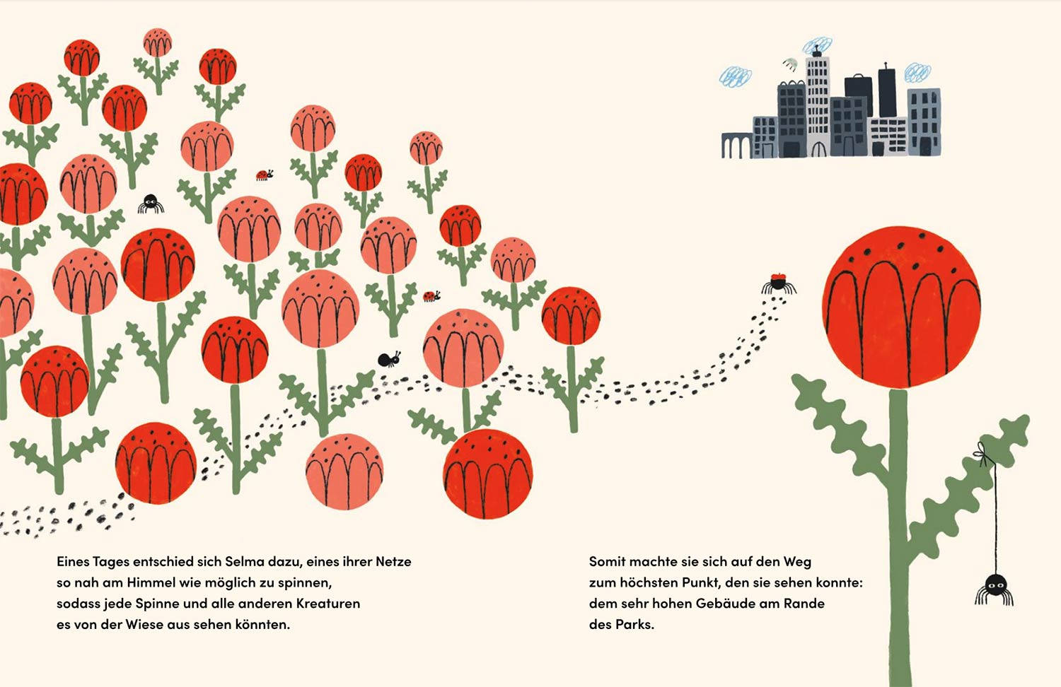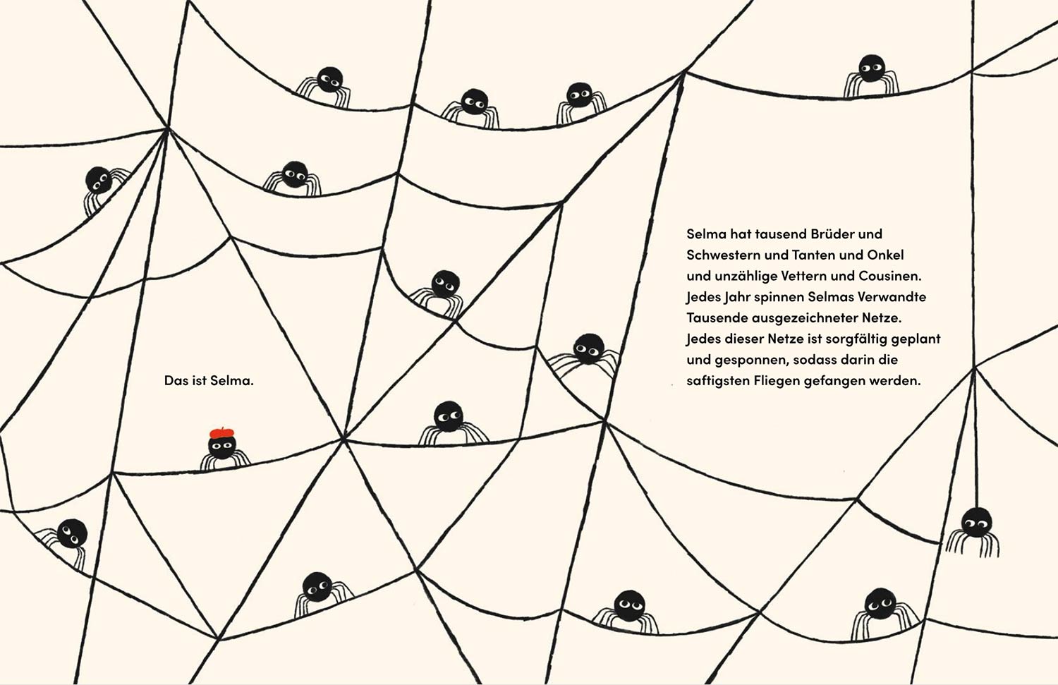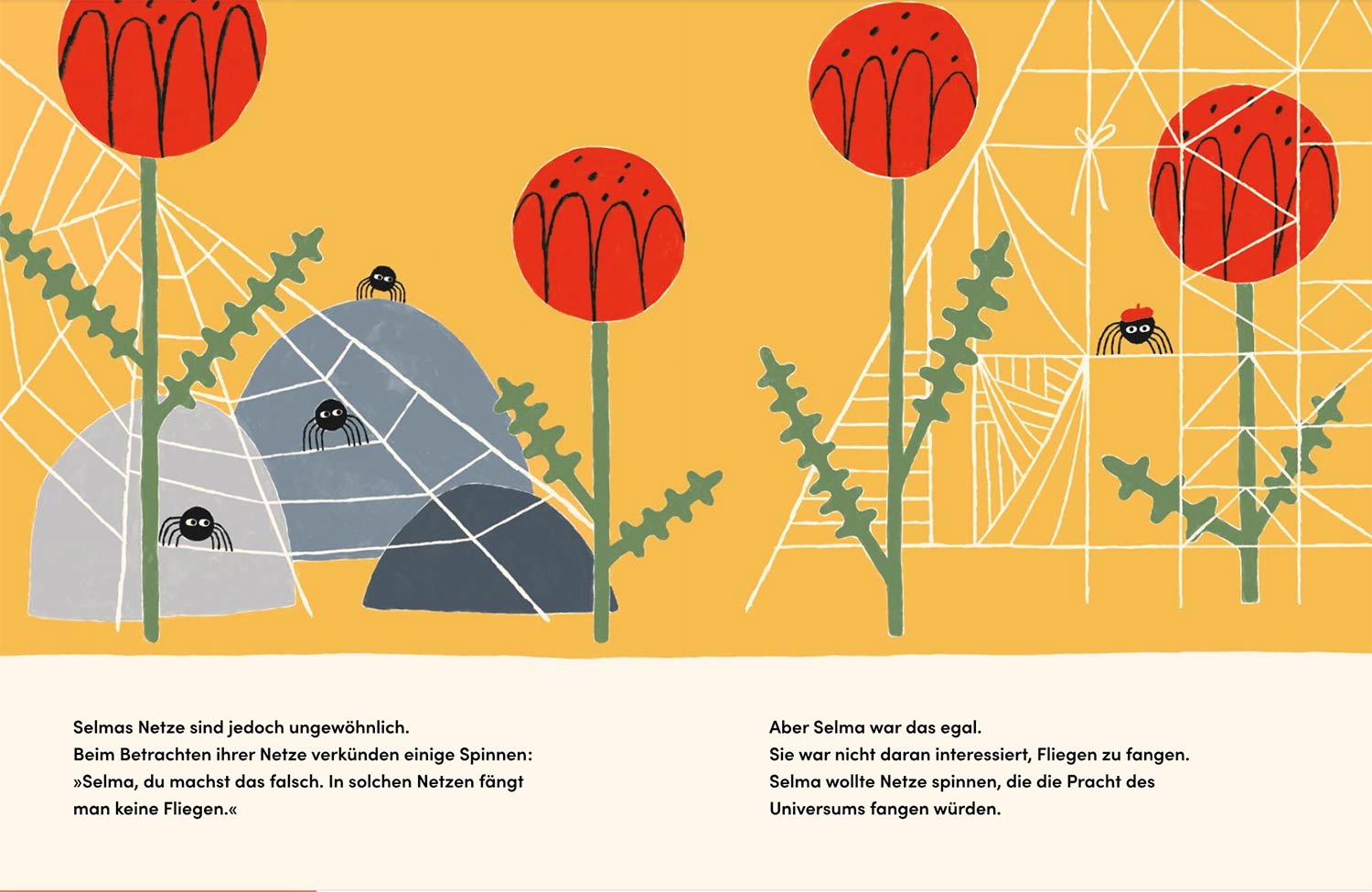 Spinnennetze sind zum Fliegenfangen da. Selma hat mit ihren Netzen aber anderes im Sinn. Ihre Netze sind Kunst! Die anderen Spinnen können damit wenig anfangen. Aber Selma hat eine Vision: Sie möchte die Pracht des Universums einfangen! Doch dafür muss sie erst einmal hoch hinaus …