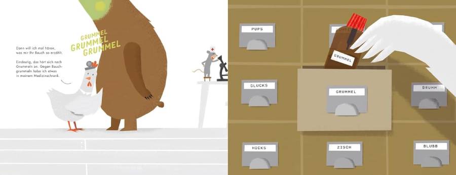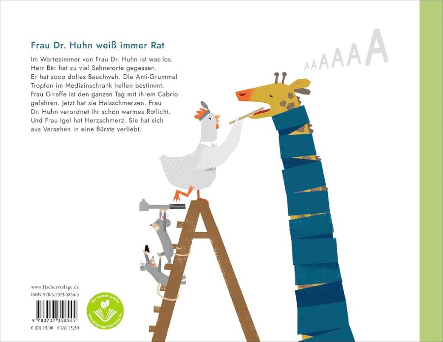 Im Wartezimmer von Frau Dr. Huhn ist was los. Herr Bär hat zu viel Sahnetorte gegessen. Er hat sooo dolles Bauchweh. Die Anti-Grummel Tropfen im Medizinschrank helfen bestimmt. Frau Giraffe ist den ganzen Tag mit ihrem Cabrio gefahren. Jetzt hat sie Halsschmerzen. Frau Dr. Huhn verordnet ihr schön warmes Rotlicht. Und Frau Igel hat Herzschmerz. Sie hat sich aus Versehen in eine Bürste verliebt. Wie konnte das passieren? Frau Dr. Huhn weiß Rat. Frau Igel braucht eine Brille! Um welche Krankheit es sich auch handelt, Frau Dr. Huhn hat für jeden ihrer Patienten die beste Medizin.