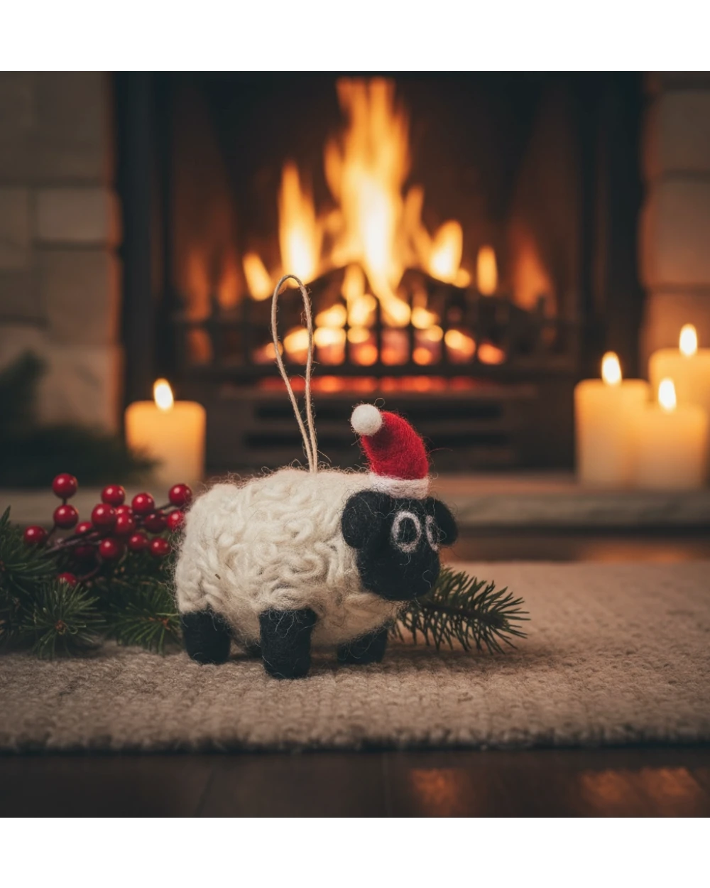 Supersweeter Filzanhänger in Form eines schwarzen Schafes mit Weihnachtsmütze vom englischen Label Felt So Good. Made in Nepal.
