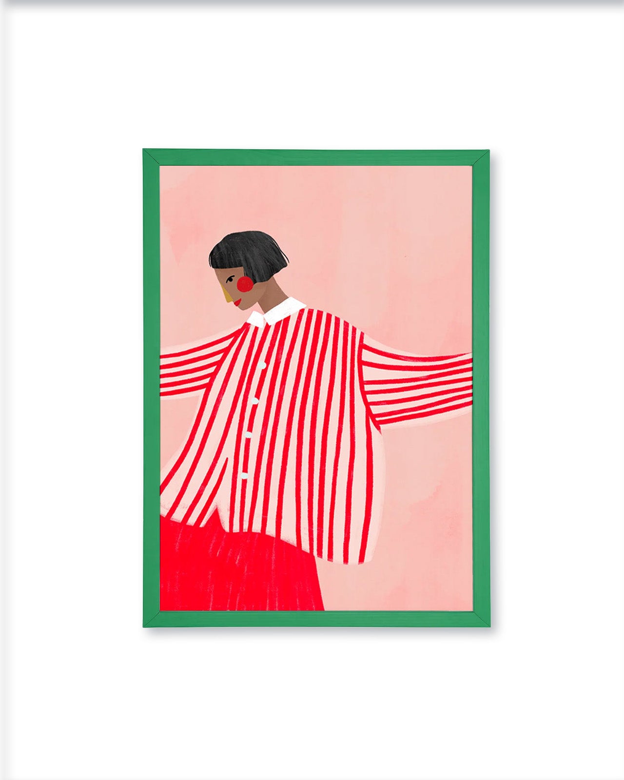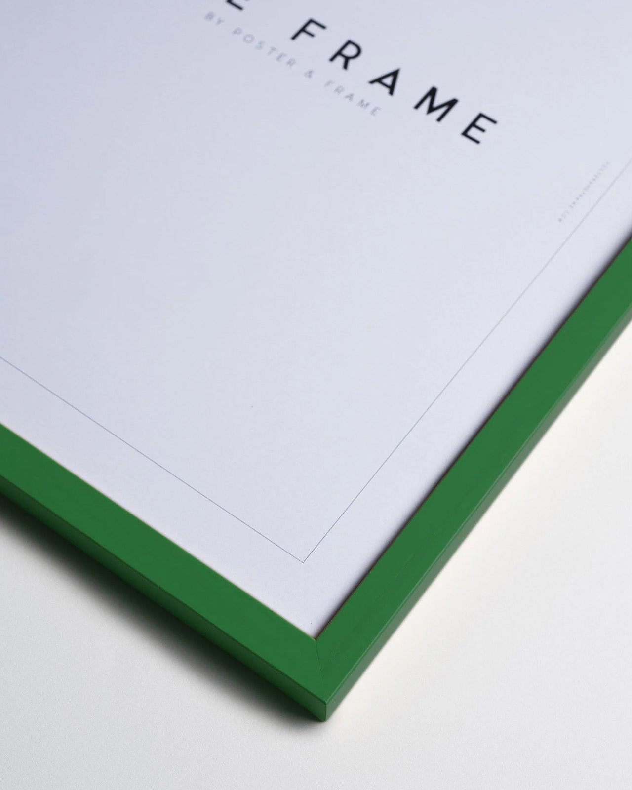 Grüner Holzrahmen aus Massivholz. Der Rahmen hat zwei Metallbügel auf der Rückseite, so dass er sowohl vertikal als auch horizontal an die Wand gehängt werden kann. Der Rahmen wird von der Rückseite aus mit Hilfe der Metallklammern geöffnet, die sich zur Seite drehen lassen, so dass du deine Kunstwerke leicht einrahmen kannst.