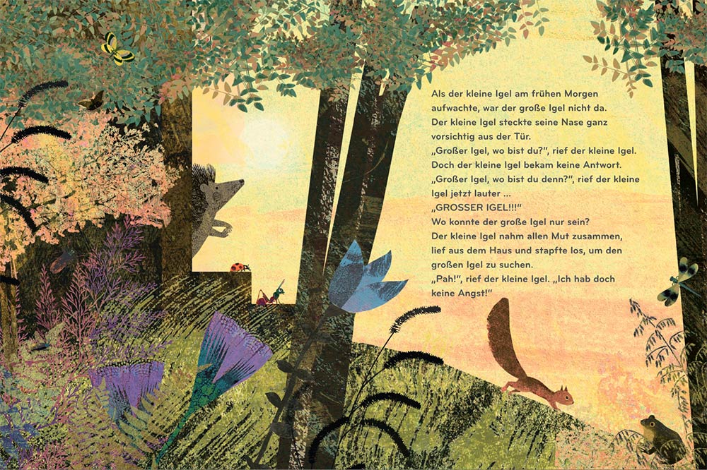 Als der kleine Igel früh am Morgen aufwacht, ist der große Igel nicht da. Der kleine Igel weiß, dass er warten muss, bis der große Igel zurück ist, aber der neugierige kleine Kerl schleicht sich aus der Tür und macht sich auf den Weg zum großen Igel. »Ich hab doch keine Angst«, sagt das Igelchen zu sich selbst.