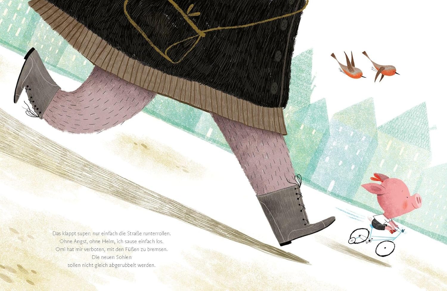 • Kleines Schweinchen im Kinderbuch Ich kann Rad fahren fährt fröhlich ohne Helm Fahrrad, begleitet von Oma und Vögeln, thematisiert Lernen und Großmutter-Enkelkinder-Solidarität.