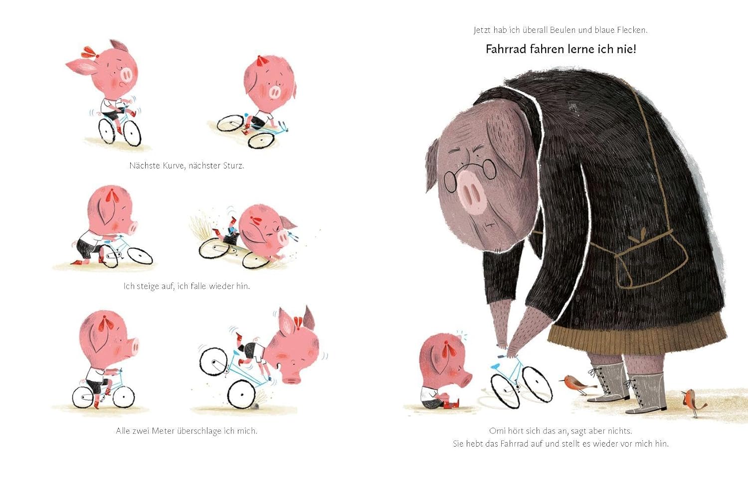 • Kinderbuch „Ich kann Rad fahren“ zeigt ein Ferkel, das Fahrradfahren lernt, mit Unterstützung seiner Omi. Eine herzerwärmende Geschichte über Beharrlichkeit und Großmutter-Enkel-Solidarität.