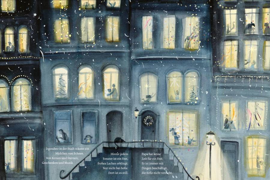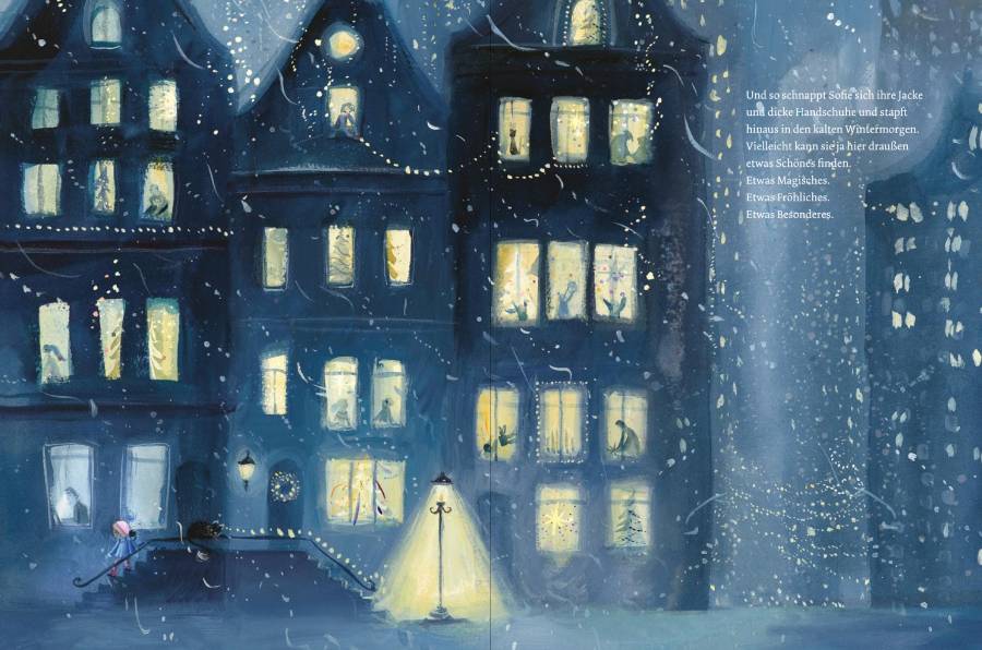 Bald ist Weihnachten. Überall in der Stadt herrscht festliche Stimmung, und aus jedem Fenster strömen Licht und Wärme. Nur nicht bei der kleinen Sofie. Ihr Vater ist leider viel zu beschäftigt, um das Haus zu schmücken und einen Weihnachtsbaum aufzustellen. Also schnappt sich Sofie Mantel und Fäustlinge und tritt hinaus in den kalten Wintermorgen. Es zieht ein Schneesturm auf, und mitten in dieser weißen Welt taucht plötzlich eine Gestalt auf. Sie nimmt Sofie mit in den Winterwald, der voller zauberhafter Weihnachtswunder steckt.