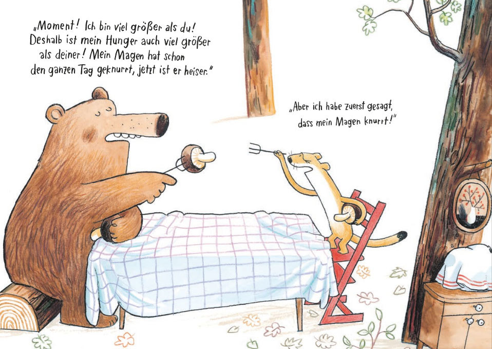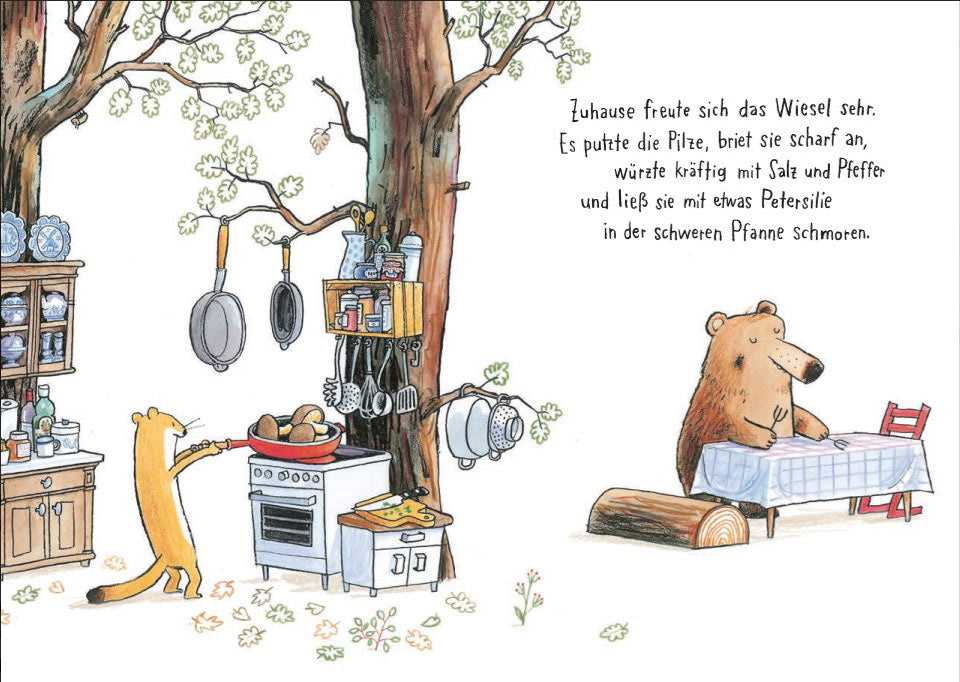 "Drei leckere Pilze findet der Bär auf dem Heimweg im Wald. Sein Freund, das Wiesel, schmort sie sogleich in der schweren Pfanne. Doch dann haben die beiden ein Problem: Drei Pilze für zwei? Wie soll das gehen? Beide bringen ein Argument nach dem anderen, warum der eine mehr als der andere bekommen müsse: »Ich hab sie gefunden!« »Ich hab sie zubereitet.« »Aber nach meinem Rezept.« »Ich esse Pilze lieber!« »Ich bin größer!« »Ich muss noch wachsen …« Bis plötzlich ein listiger Fuchs um die Ecke biegt und sich einen Pilz schnappt. Der hat einfach unseren Pilz geklaut! Gleichzeitig ist damit aber auch das Problem gelöst und Ruhe kehrt ein. Wenn das Wiesel nicht noch einen Nachtisch hätte: Drei Walderdbeeren …