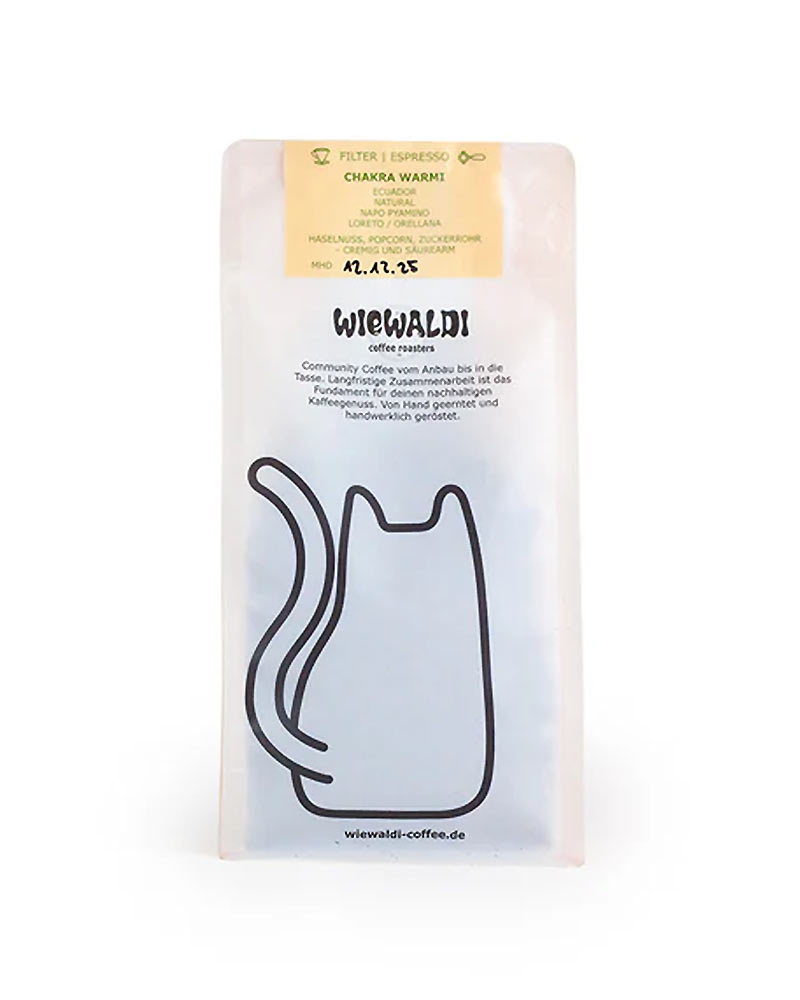 Unser Chakra Warmi natural ist als Medium Roast geröstet. Er eignet sich für einen kräftigen Filterkaffee genauso wie für einen spritzigen Espresso! Er zeichnet sich durch seinen vollen Körper und seine karamellartige Cremigkeit aus. Der Kaffee ist besonders mild und säurearm.