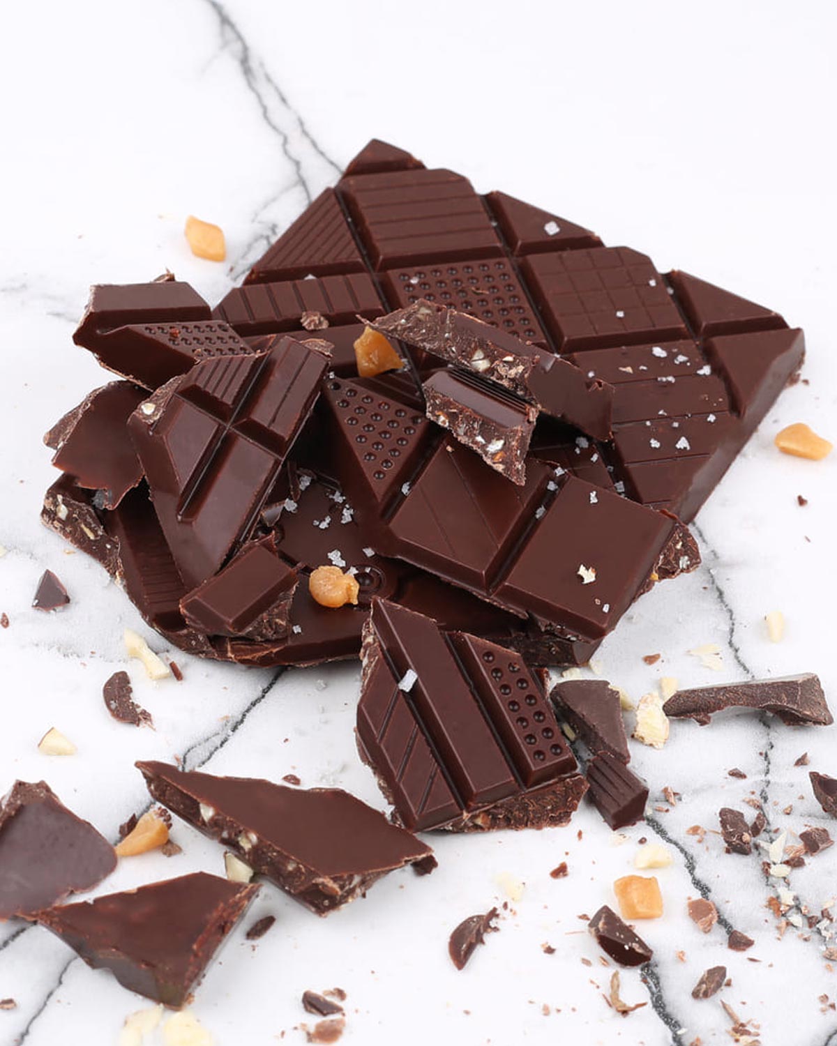 Feinste dunkle, französische Bio-Schokolade „Triomphe“ mit Mandeln und gesalzenem Karamell vom Pariser Label Le Chocolat des Francais.