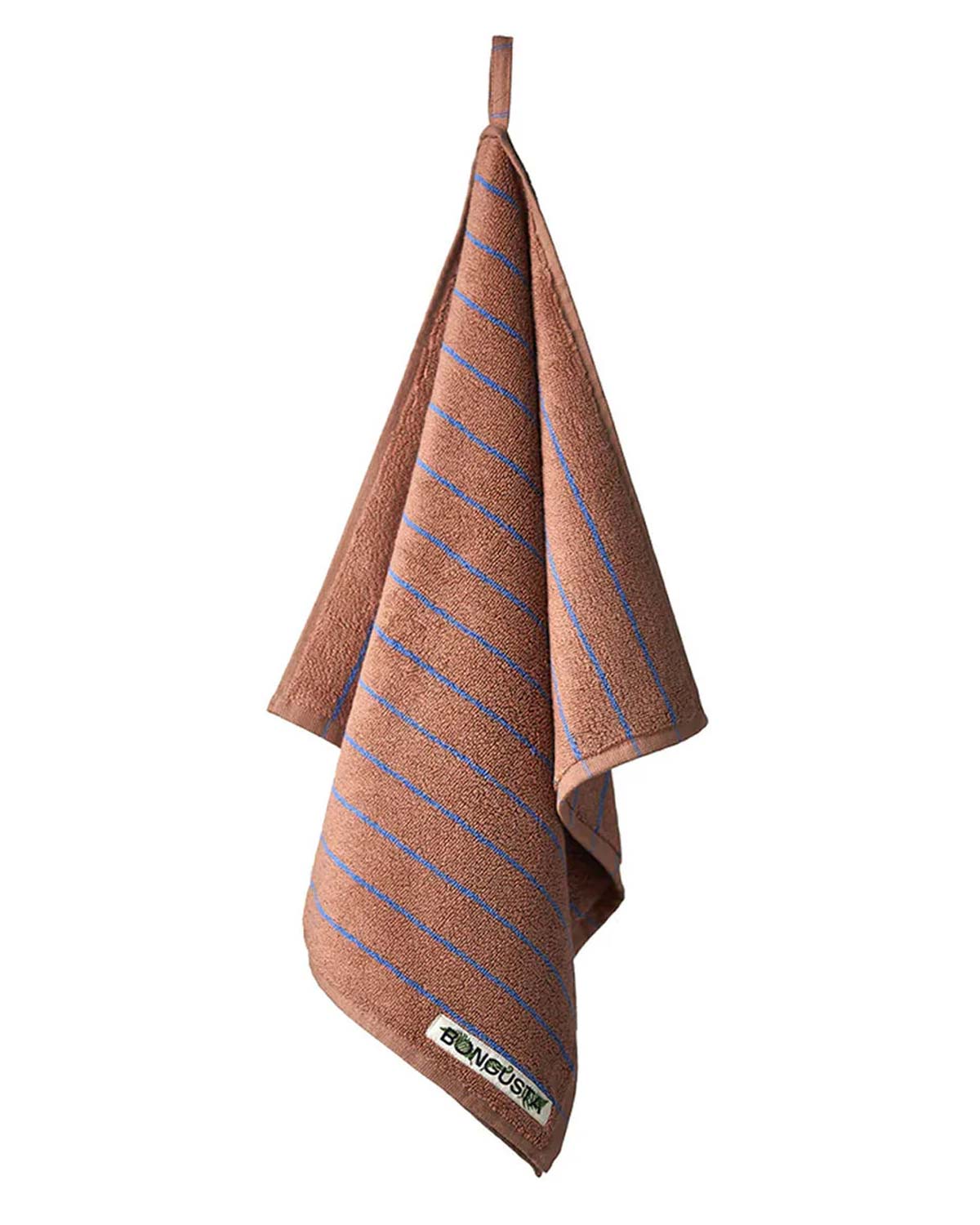 Auf der Vorderseite des Naram Towel ist ein dekoratives Logo des Labels Bongusta aufgestickt, das dem Design einen Hauch von Eleganz verleiht. Das Handtuch hat eine dicke Frotteeoberfläche über die gesamte Fläche, die ein weiches und angenehmes Gefühl auf der Haut gewährleistet. Das Handtuch ist mit einer praktischen Schlaufe zum Aufhängen ausgestattet.