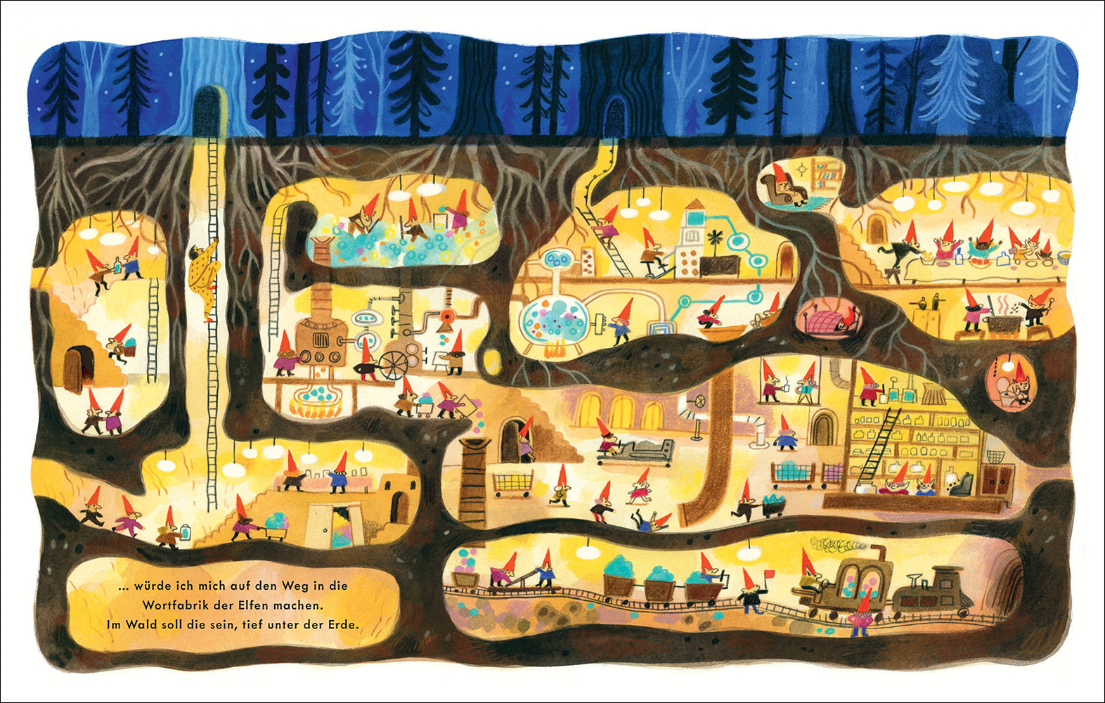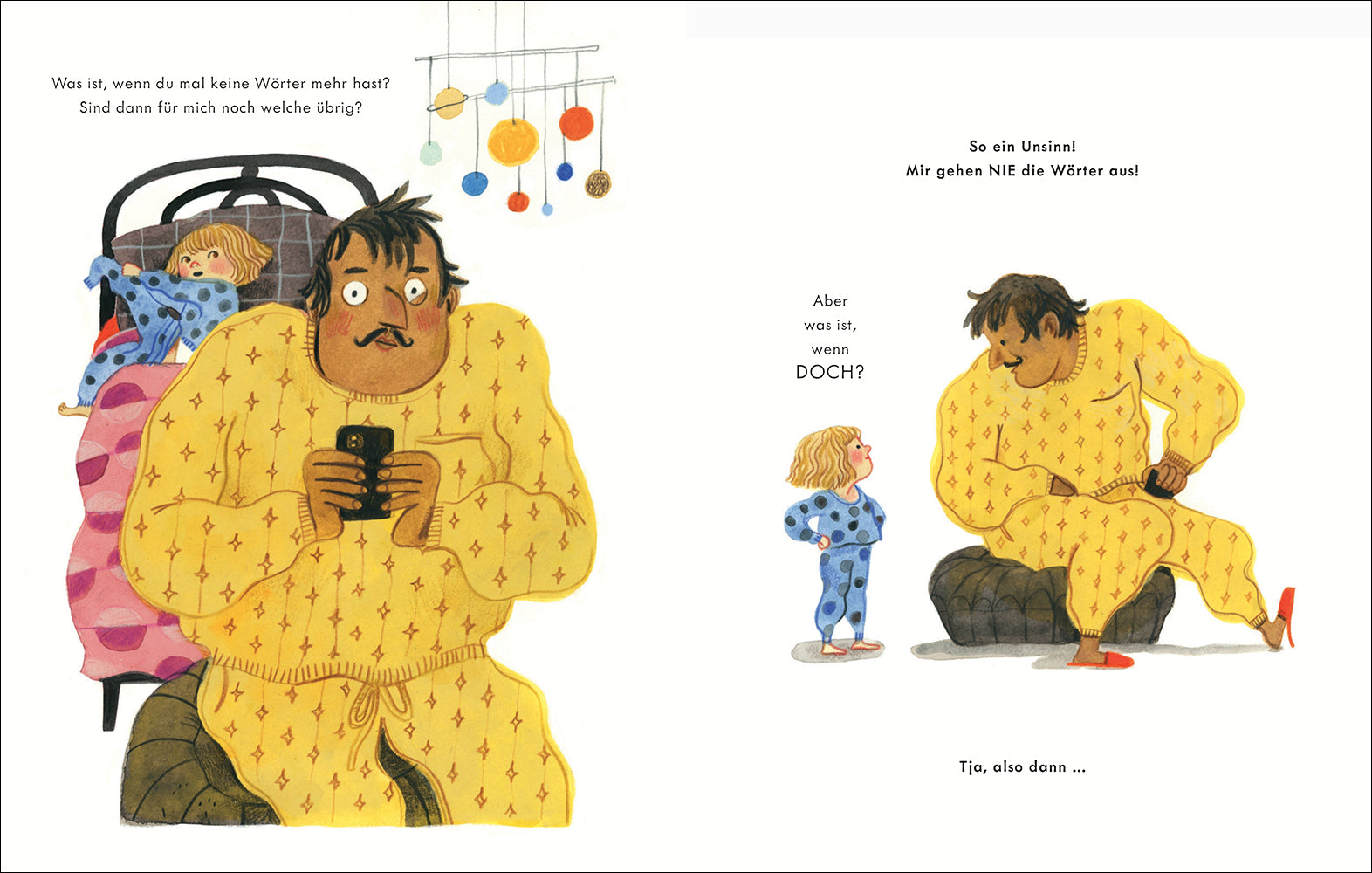 »Den ganzen Tag hat Papa so viel gesprochen, kann es da nicht sein, dass ihm irgendwann die Wörter ausgehen und er für mich gar keine mehr übrig hat?« Diese Frage beschäftigt das Mädchen kurz vorm Zubettgehen. Und ohne eine Antwort ihres Papas kann sie natürlich nicht einschlafen. Also versucht der Papa ihr die Sorgen zu nehmen – doch die Was-wäre-wenn-Fragen sprudeln nur so aus dem Mädchen heraus. Zum Glück findet er die passenden Antworten: Wenn ihm jemals die Wörter ausgehen sollten, dann würde er sich in der Wortfabrik der Elfen neue Wörter holen. Auch wenn das bedeutet, dass er durch düstere Wälder laufen, vor Piraten fliehen oder mit einer Rakete wieder nach Hause fliegen muss – denn für seine Tochter ist ihm kein Weg zu weit.