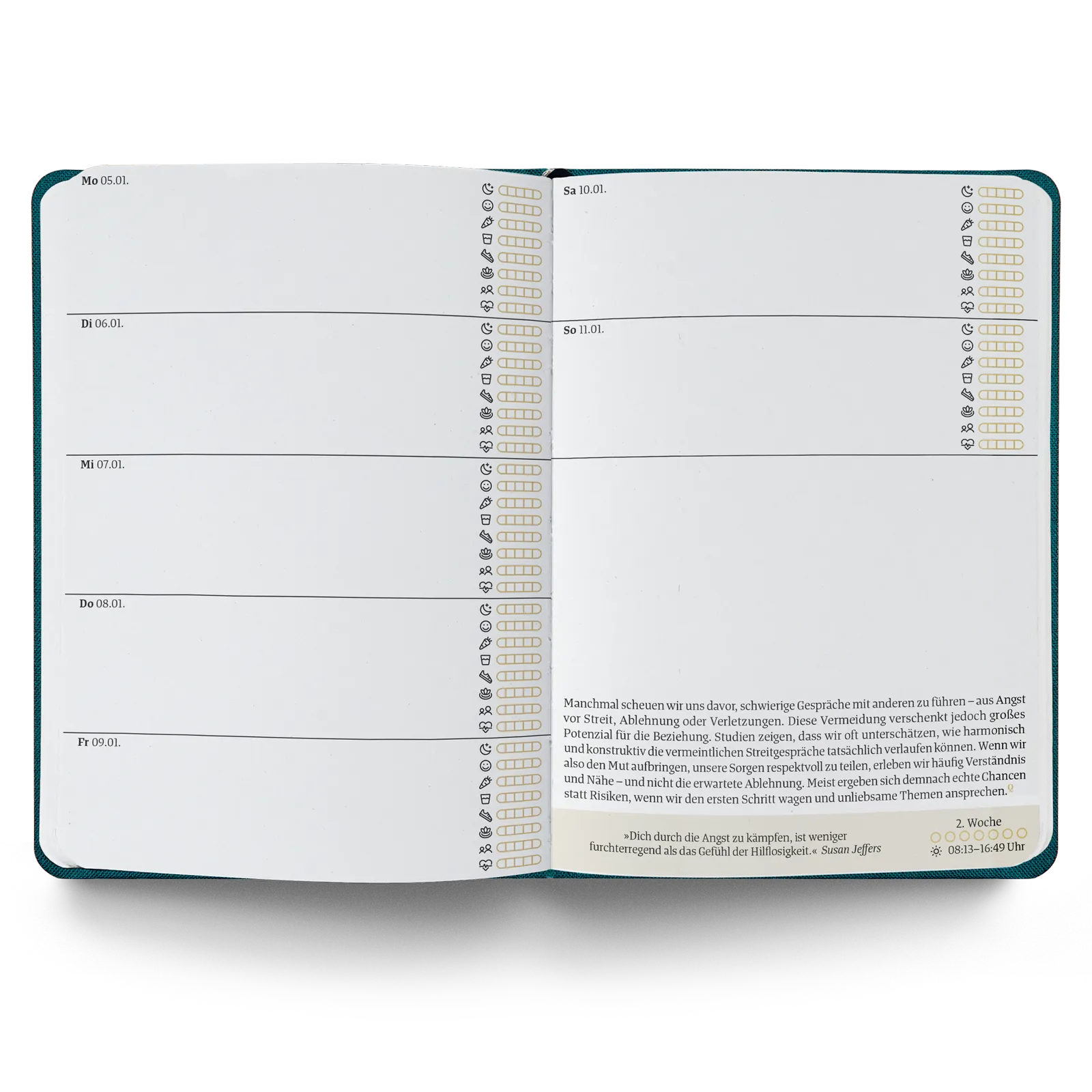 Ein guter Plan Mini 2026 ist ein ganzheitlicher Terminkalender für mehr Achtsamkeit und Selbstliebe im handlichen Format DIN-A6. Es ist mit Abstand unser kleinster Kalender und wurde auf Wunsch unserer Community entwickelt. Mit ihm kannst du dich auch unterwegs in Achtsamkeit und Entschleunigung üben, ohne deine Termine zu vernachlässigen.