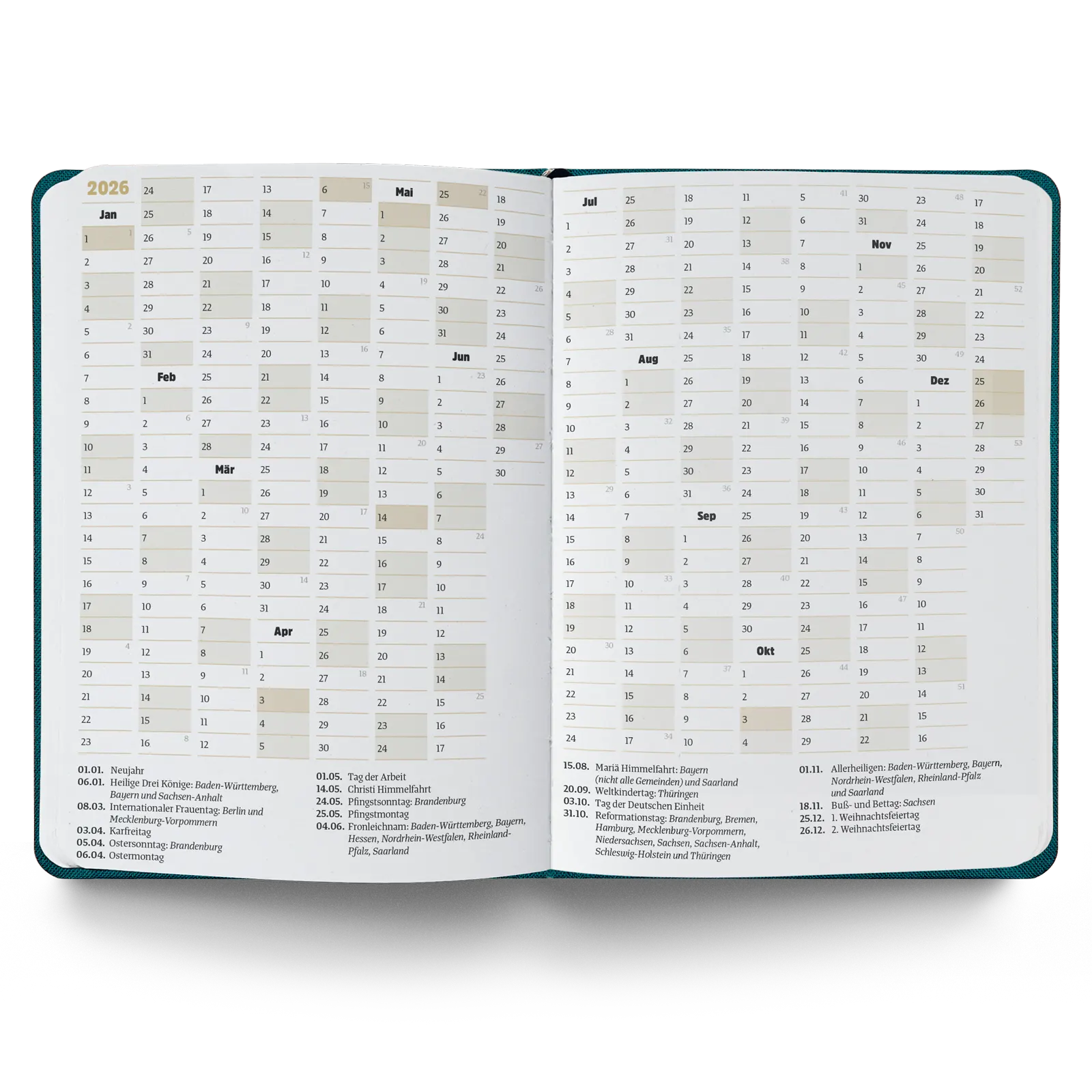 Ein guter Plan Mini 2026 ist ein ganzheitlicher Terminkalender für mehr Achtsamkeit und Selbstliebe im handlichen Format DIN-A6. Mit ihm kannst du dich auch unterwegs in Achtsamkeit und Entschleunigung üben, ohne deine Termine zu vernachlässigen.