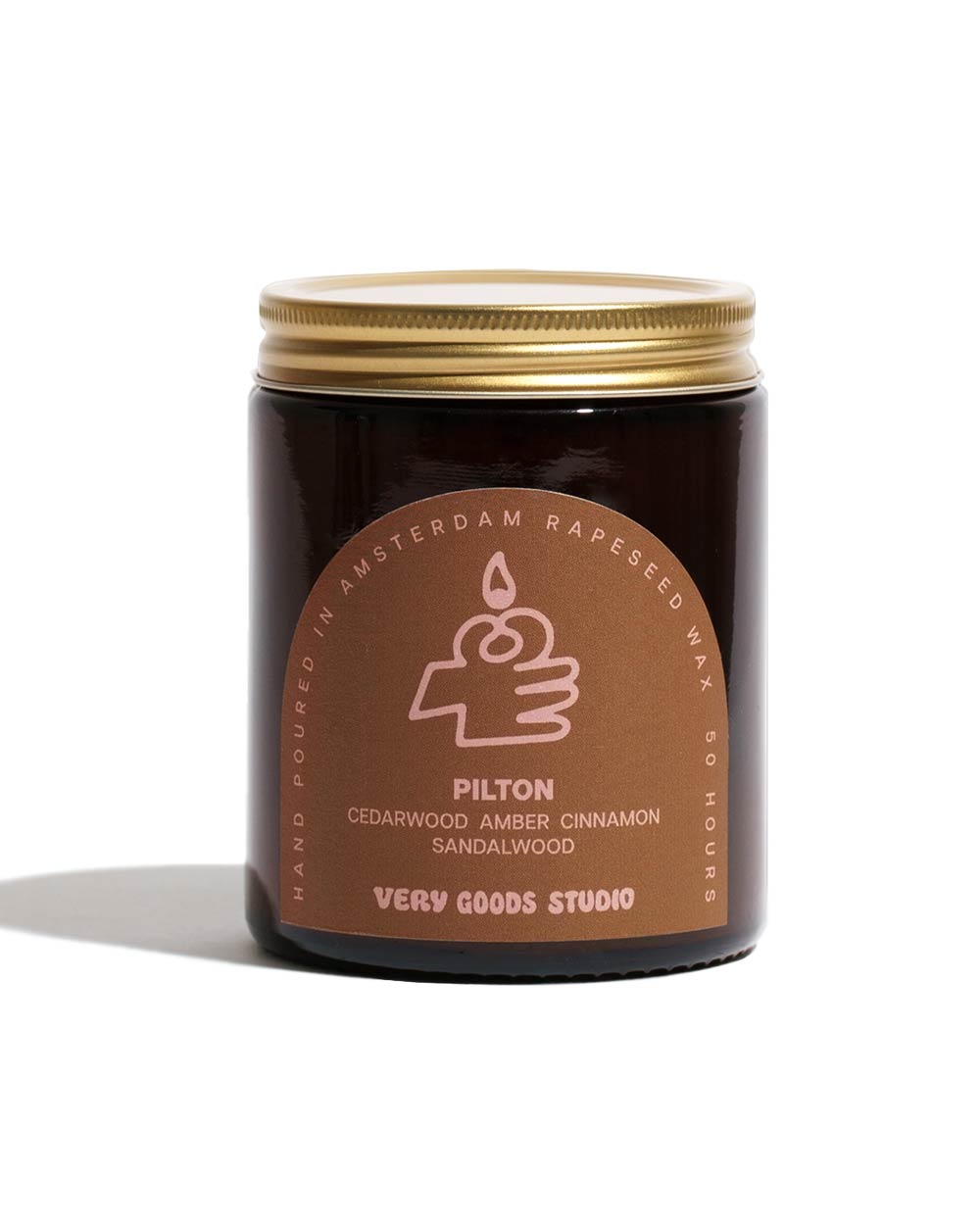 • Pilton Duftkerze 170ml in recyceltem Braunglas mit goldfarbenem Schraubdeckel, handgefertigt in den Niederlanden, bietet 50 Stunden holzigen Duft mit Sandelholz und Zimt.