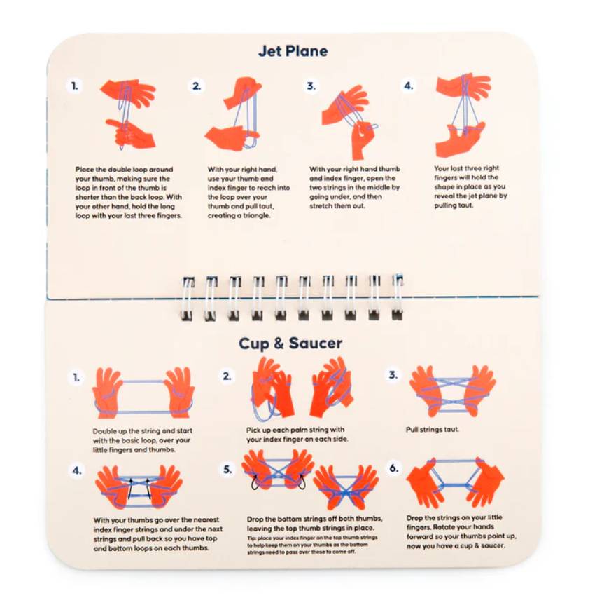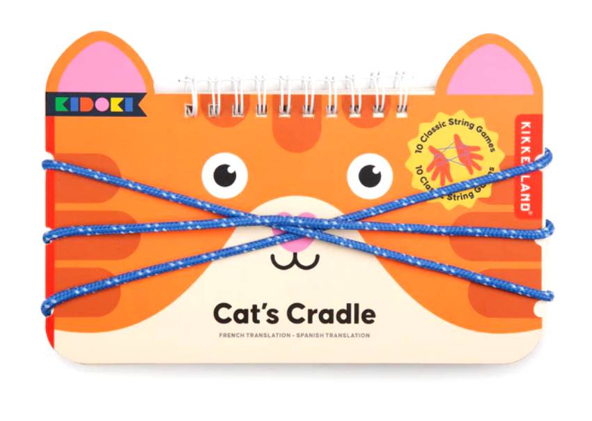 Cat's Cradle-Handspiel von Kikkerland. Kidoki Cat's Cradle ist eine Abwandlung des traditionellen Handspiels, das von Kindern seit Generationen gespielt wird. Drahtgebundene Bücher mit Katzengesichtern und Schnur, um verschiedene Katzenwiegen zu kreieren, wie z.B. Tasse und Untertasse, Düsenflugzeug, Stern, Katzenschnurrbart und Hexenbesen. Fördert die Kreativität und Geschicklichkeit der Finger.