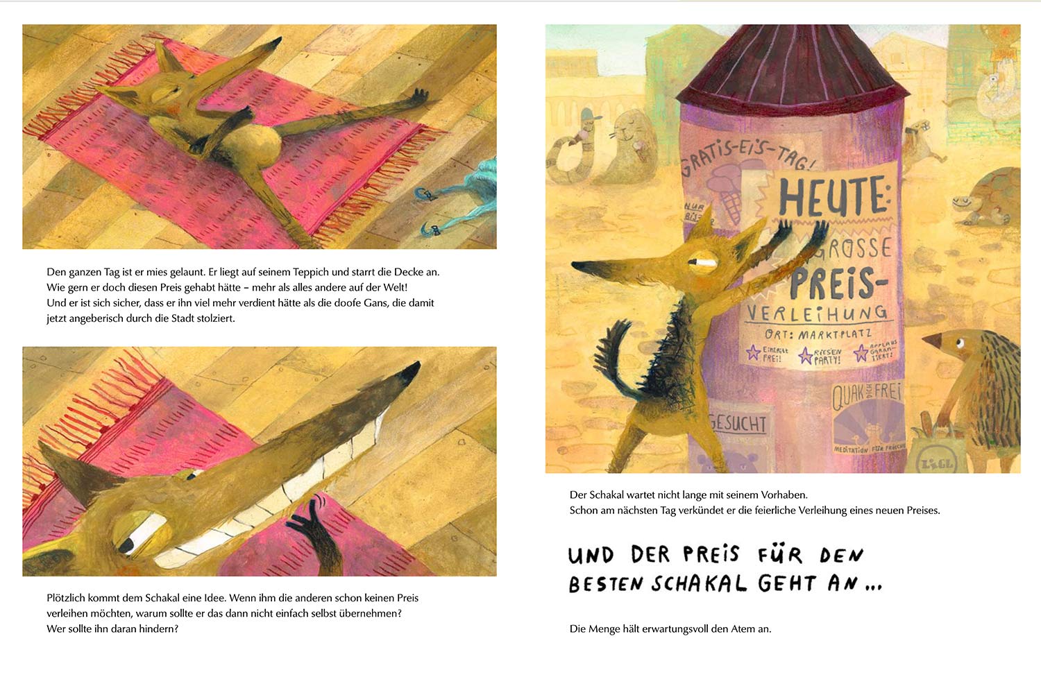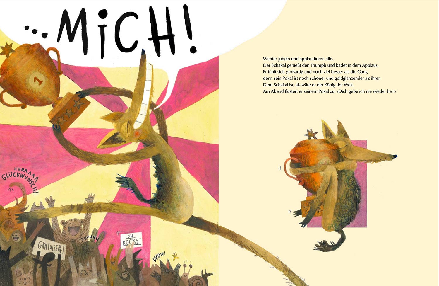 Der Schakal träumt von einem Pokal. Nur blöd, räumt die Gans den Preis für die schönste Frisur ab. Kurzerhand veranstaltet der Schakal eine neue Preisverleihung mit der Auszeichnung für »den besten Schakal«, die er natürlich gewinnt. Kein Wunder, dass sich nun ein Tier nach dem anderen seinen eigenen Preis verleiht! Das passt dem Schakal gar nicht, denn er verdient doch die größte aller Auszeichnungen…