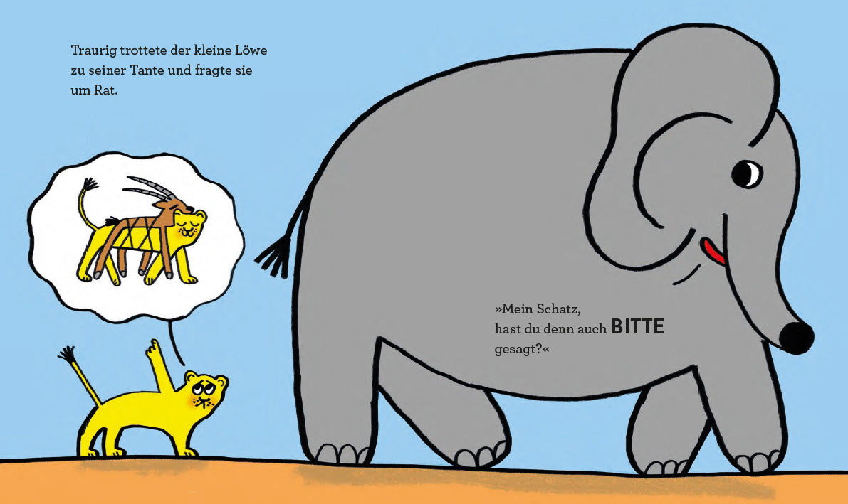 Papa Löwe findet, der kleine Löwe solle nun endlich seine erste Gazelle fangen. Doch der Weg dahin ist beschwerlich. Der kleine Löwe macht einen Fehler nach dem anderen: Viel zu selbstsicher geht er es beim ersten Mal an – und scheitert. Beim zweiten Mal ist er nicht schnell, beim dritten Mal nicht schlau genug. Nicht einmal, wenn er »Bitte« sagt, kommt er weiter und muss sogar aushalten, dass sich eine ganze Gazellenherde über ihn amüsiert. Wie es dem kleinen Löwen schließlich doch gelingt, die Gazelle zu fangen und in sein Versteck zu schleppen, ist überraschend – aber noch viel überraschender ist, was er dann zu ihr sagt.