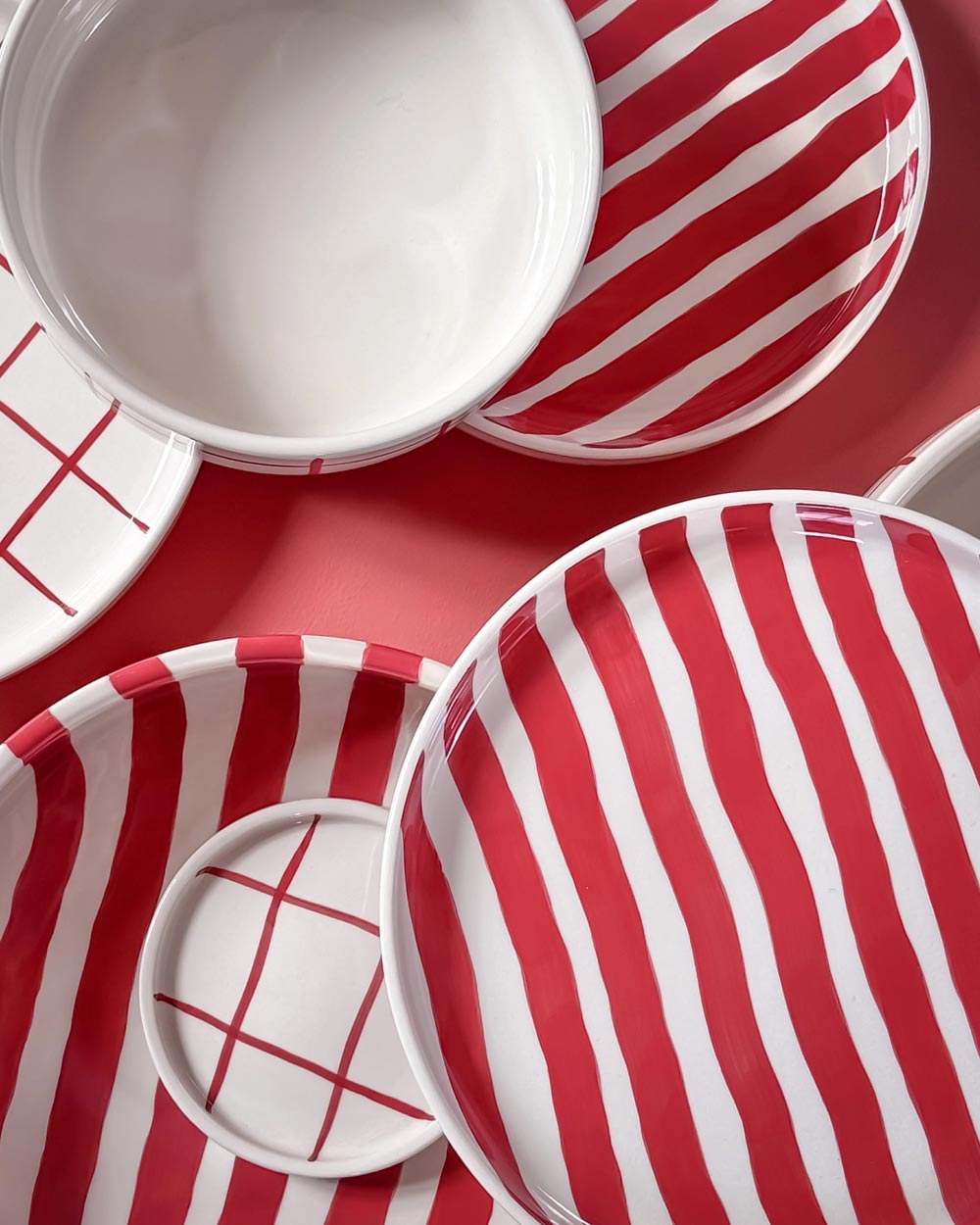 Der kleinere Keramikteller im Bold Stripes-Design in sattem Rot vom Stuttgarter Designlabel Magazin Minori.