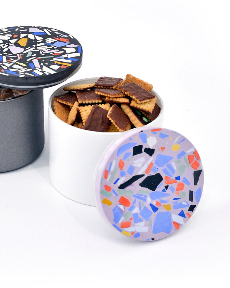 Ein Glasbehälter (weiß) mit handgefertigtem, luftdichtem Terrazzo-Deckel. Die Terrazzo Dose LUX eignet sich in der Küche perfekt zur luftdichten Aufbewahrung von Leckereien, Gewürzen, Tee, Kaffee u.v.m. . Auch im Badezimmer oder auf dem Schreibtisch setzt die Dose einen tollen Akzent.