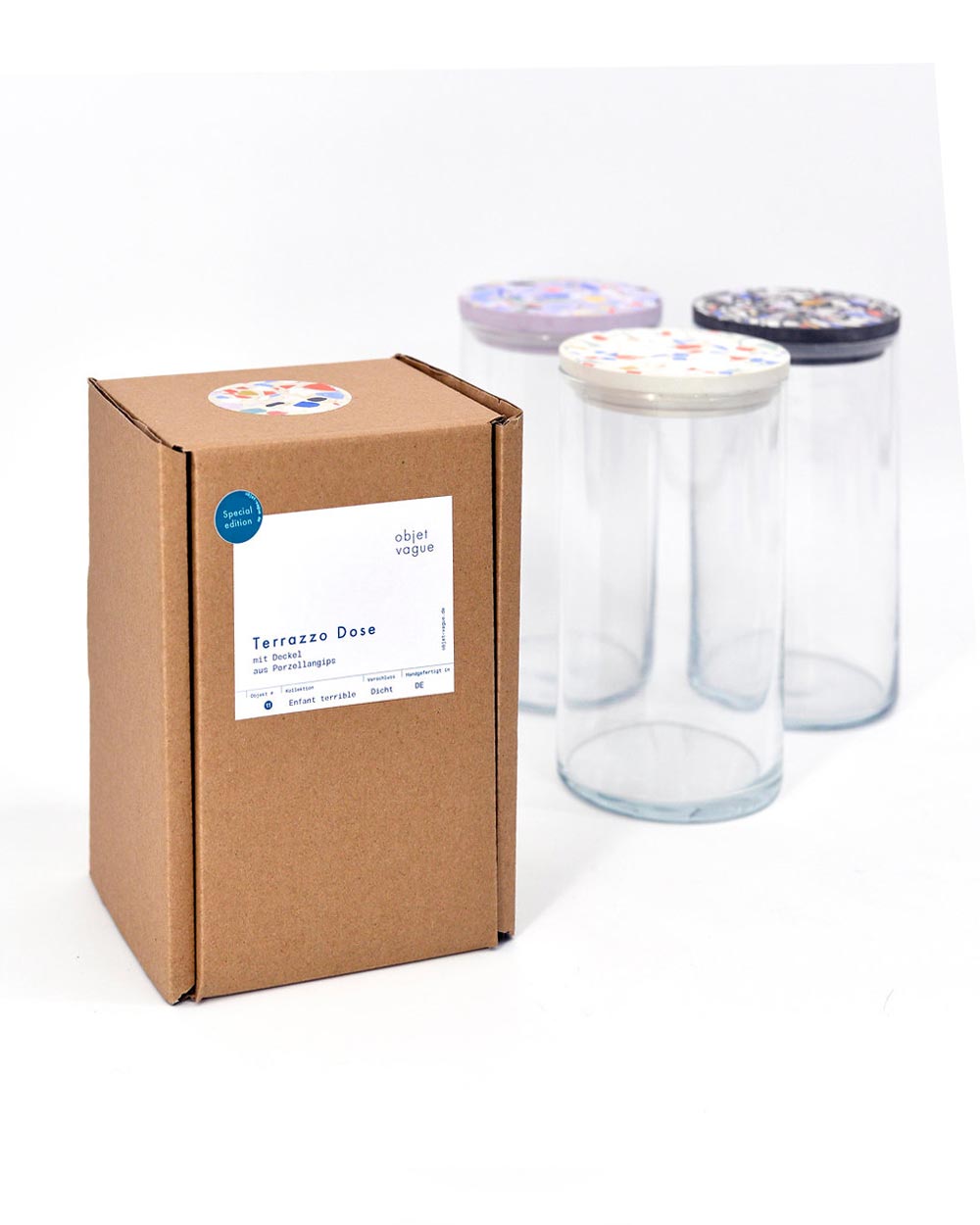 Der Terrazzo Deckel wird in unserer Werkstatt in Niedersachsen gefertigt und besteht aus einem in Deutschland produzierten Porzellan-Gips. Der hochwertige Glasbehälter wird in Europa hergestellt.