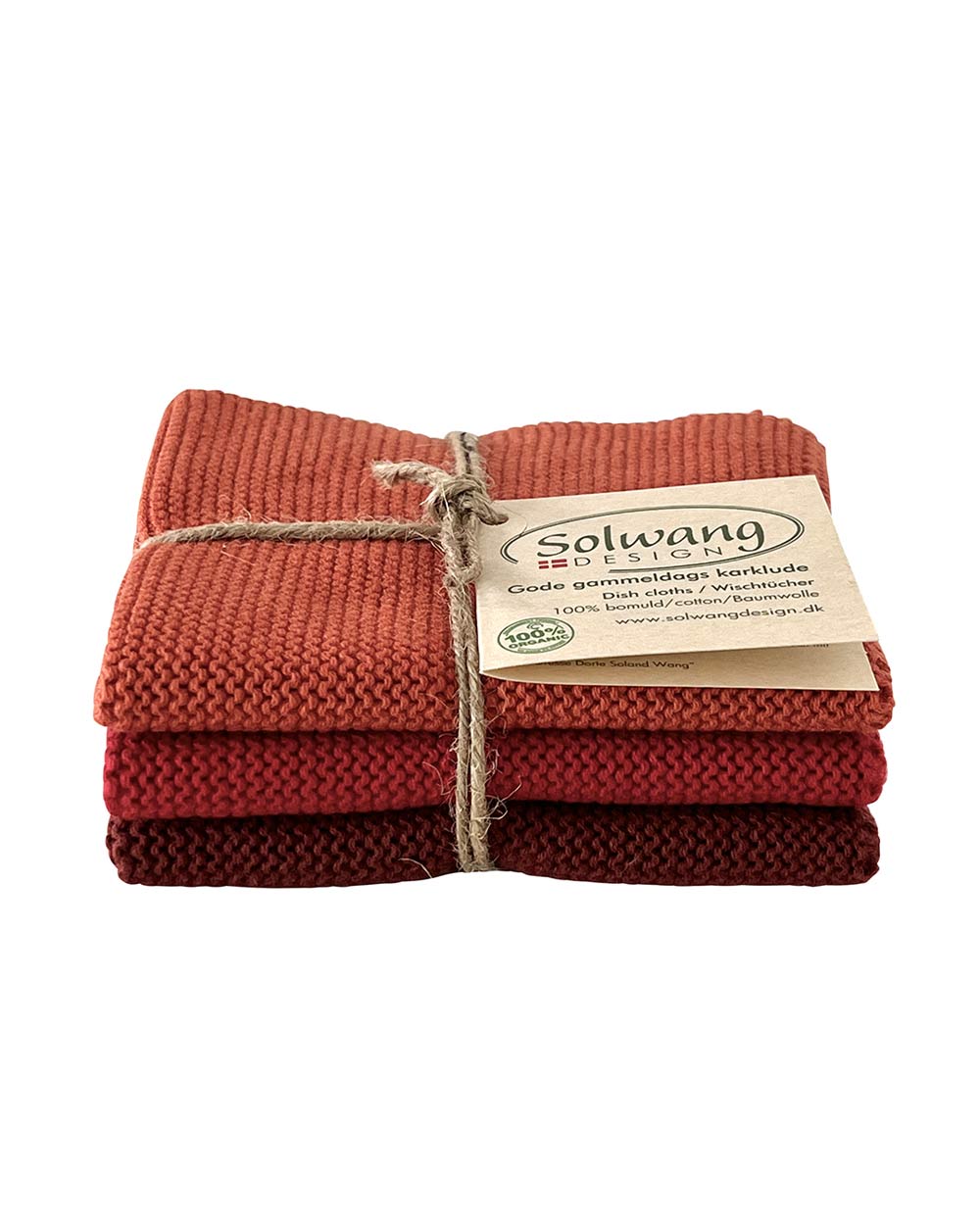 • Drei gestrickte Solwang Wischtücher in warmen Tönen, gebunden mit Jutegarn, ideal als vielseitiges Geschenk, gefertigt aus 100% Bio-Baumwolle, 25x25 cm.