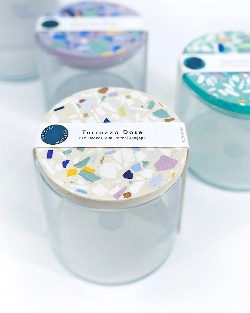 Ein Glasbehälter mit handgefertigtem, luftdichtem Deckel. Die Terrazzo Dose eignet sich in der Küche perfekt zur luftdichten Aufbewahrung von Leckereien, Gewürzen, Tee, Kaffee u.v.m. . Auch im Badezimmer oder auf dem Schreibtisch setzt die Dose einen tollen Akzent.