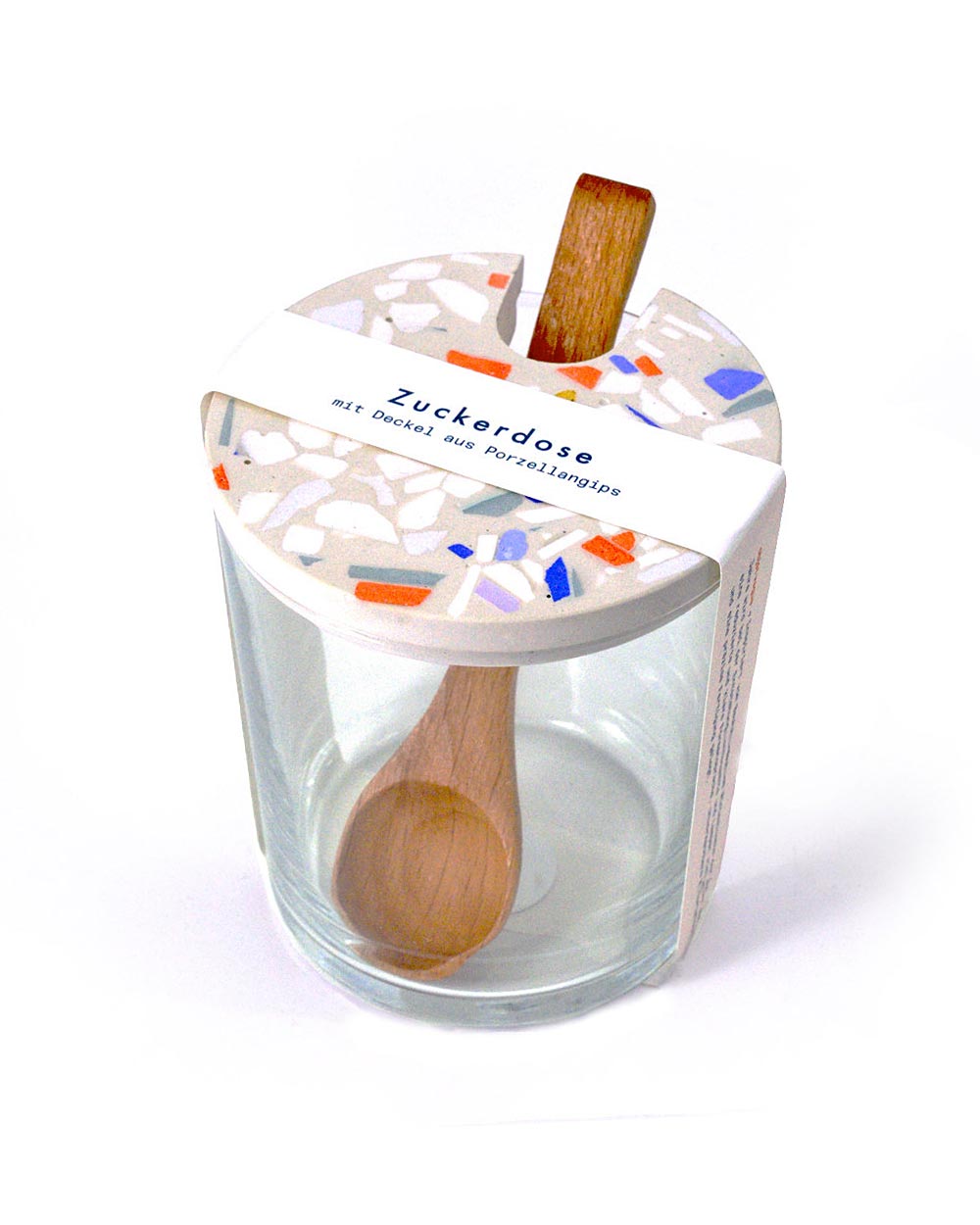 Der Terrazzo Deckel wird in unserer Werkstatt in Niedersachsen gefertigt und besteht aus einem in Deutschland produzierten Porzellan-Gips. Der hochwertige Glasbehälter wird in Europa hergestellt.