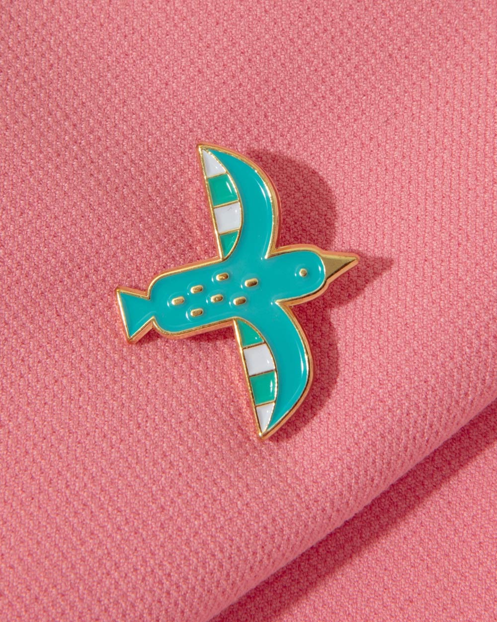Emaille-Pin der spanischen Künstlerin Ana Seixas, mit einem Vogel in Blau, Grün und Weiß. Hochglanz-Goldbeschichtung und Metallverschluss.