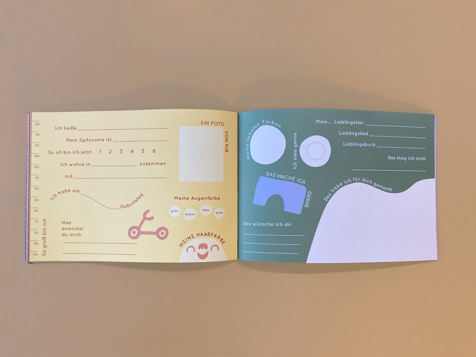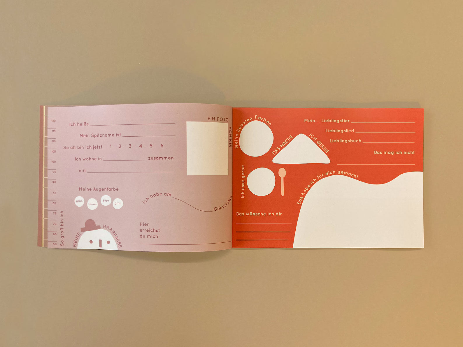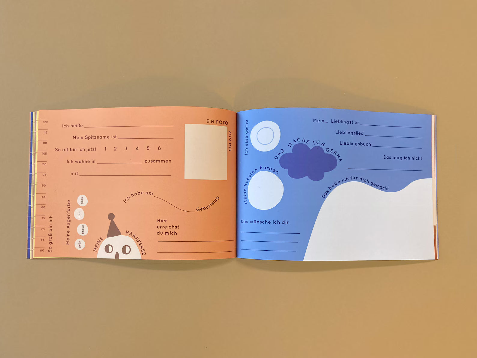 Es bietet Platz für 22 Kinder, die jeweils (mit Hilfe eines Erwachsenen) eine der unterschiedlich gestalteten Doppelseiten ausfüllen und dazu etwas malen / aufkleben können. Außerdem kann jedes Kind seinen Geburtstag in den Kalender am Anfang des Büchleins eintragen. Ganz hinten können Alle einen Fingerabdruck hinterlassen.