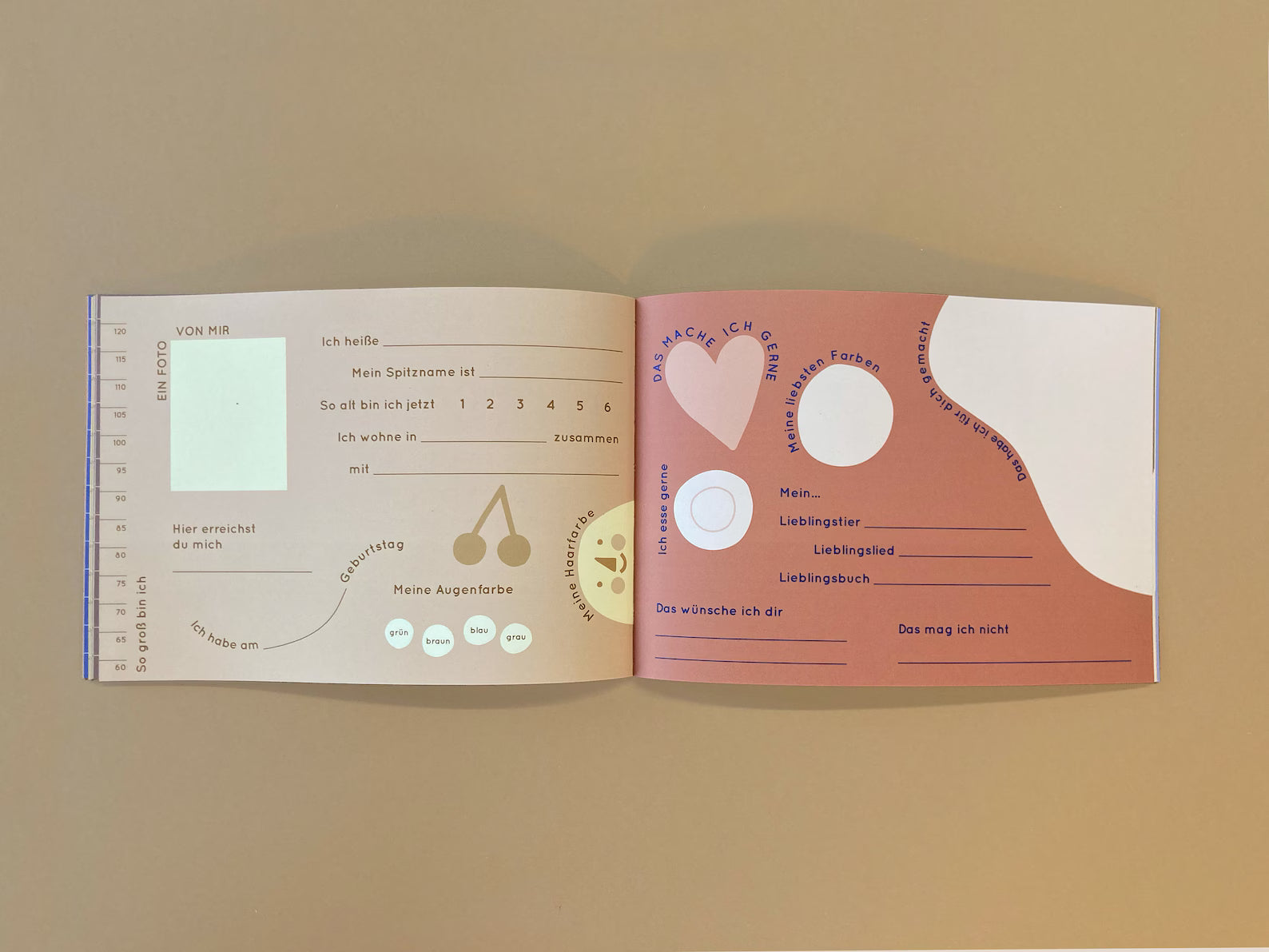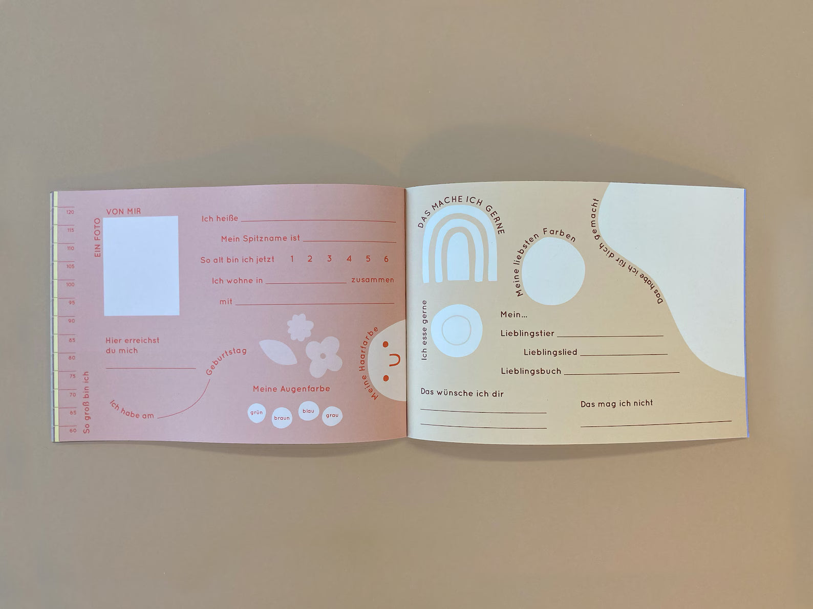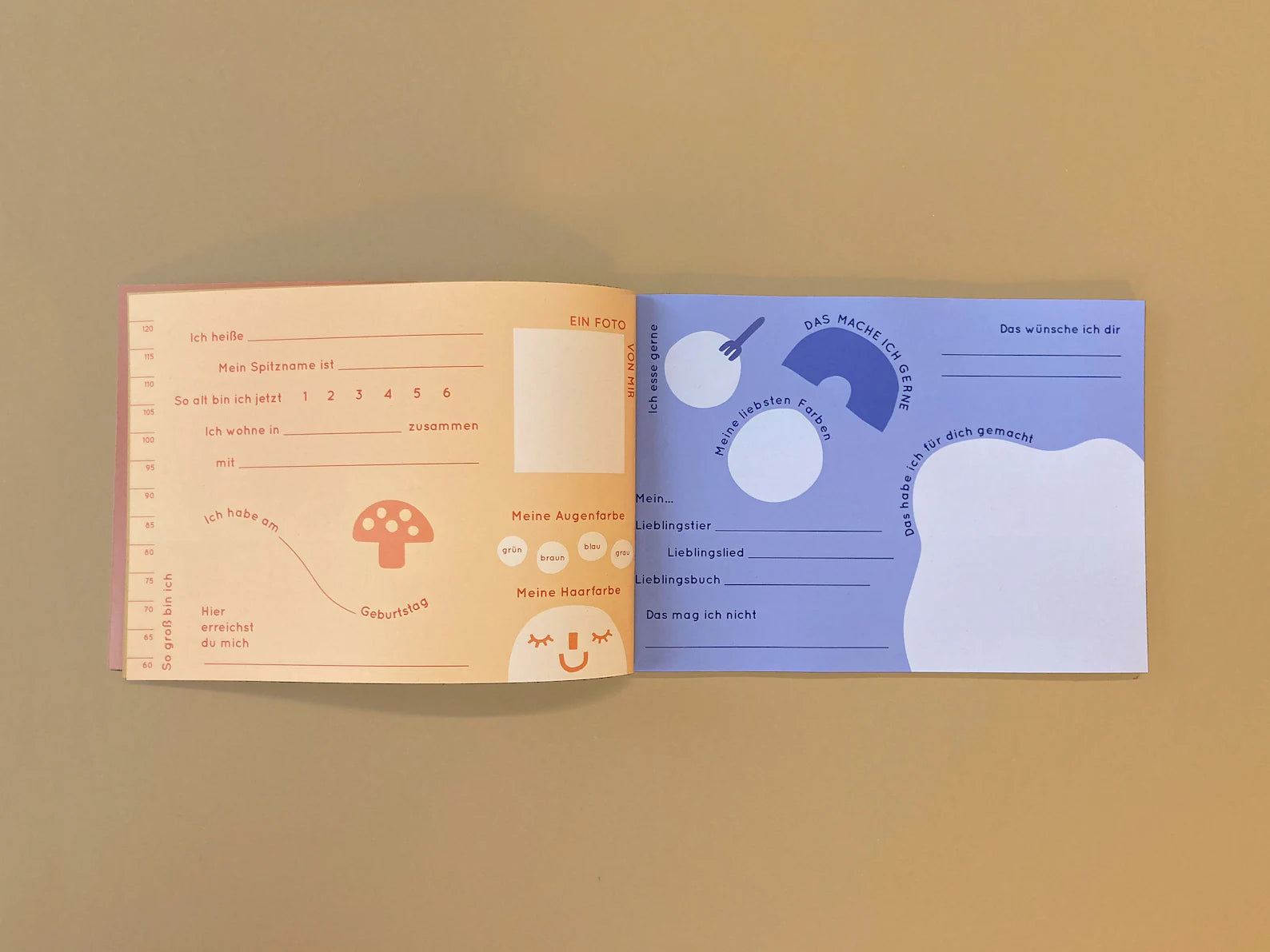 Es bietet Platz für 22 Kinder, die jeweils (mit Hilfe eines Erwachsenen) eine der unterschiedlich gestalteten Doppelseiten ausfüllen und dazu etwas malen / aufkleben können. Außerdem kann jedes Kind seinen Geburtstag in den Kalender am Anfang des Büchleins eintragen. Ganz hinten können Alle einen Fingerabdruck hinterlassen.