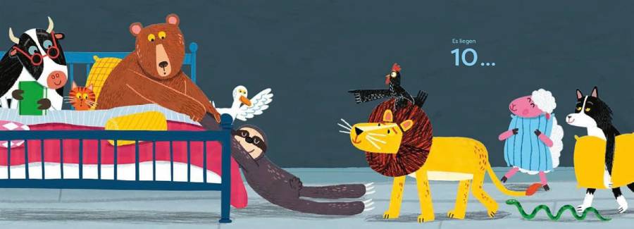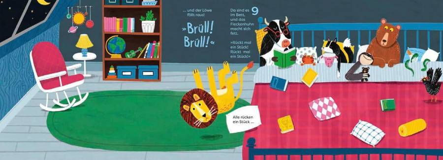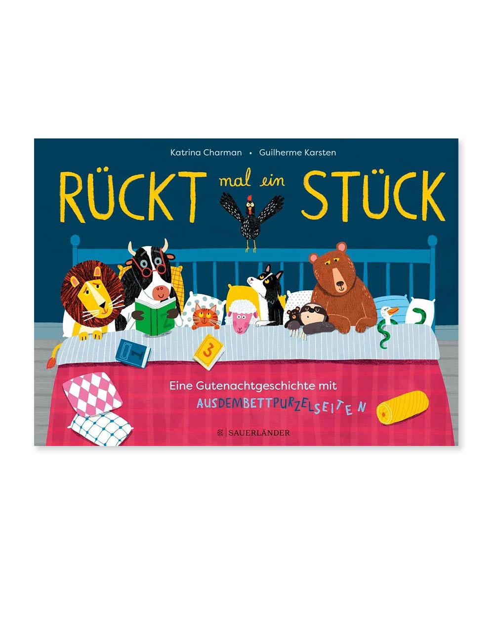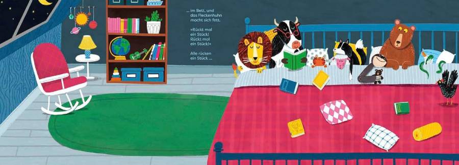 Wenn 10 ins Bett sollen, dann wird beim Abendritual schon mal aus dem Bett gekullert, gestolpert und übereinandergeplumpst. Immer heißt es wieder »Rückt mal ein Stück«. Es sollen aber doch alle schlafen geh'n. Ist in diesem großen Bett wirklich Platz für 10?! »Rückt mal ein Stück«, bestimmt das Huhn. Einer fällt raus. Und nun? Im Bett sind nur noch 9. Jetzt muss doch Platz für alle sein. »Rückt mal ein Stück!«, gackert es da wieder. Und schon plumpst noch einer raus. Jetzt sind es nur noch 8. Wird das jemals eine ruhige Nacht?