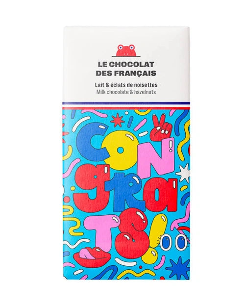 Feinste französische Bio-Milchschokolade „Congrats“ mit Haselnusssplittern vom Pariser Label Le Chocolat des Francais. Die „Congrats!”-Tafel, illustriert von Lindsay Made This, kombiniert zarte Milchschokolade mit knackigen, gerösteten Haselnussstücken. Eine kleine Aufmerksamkeit zum Reinbeißen.