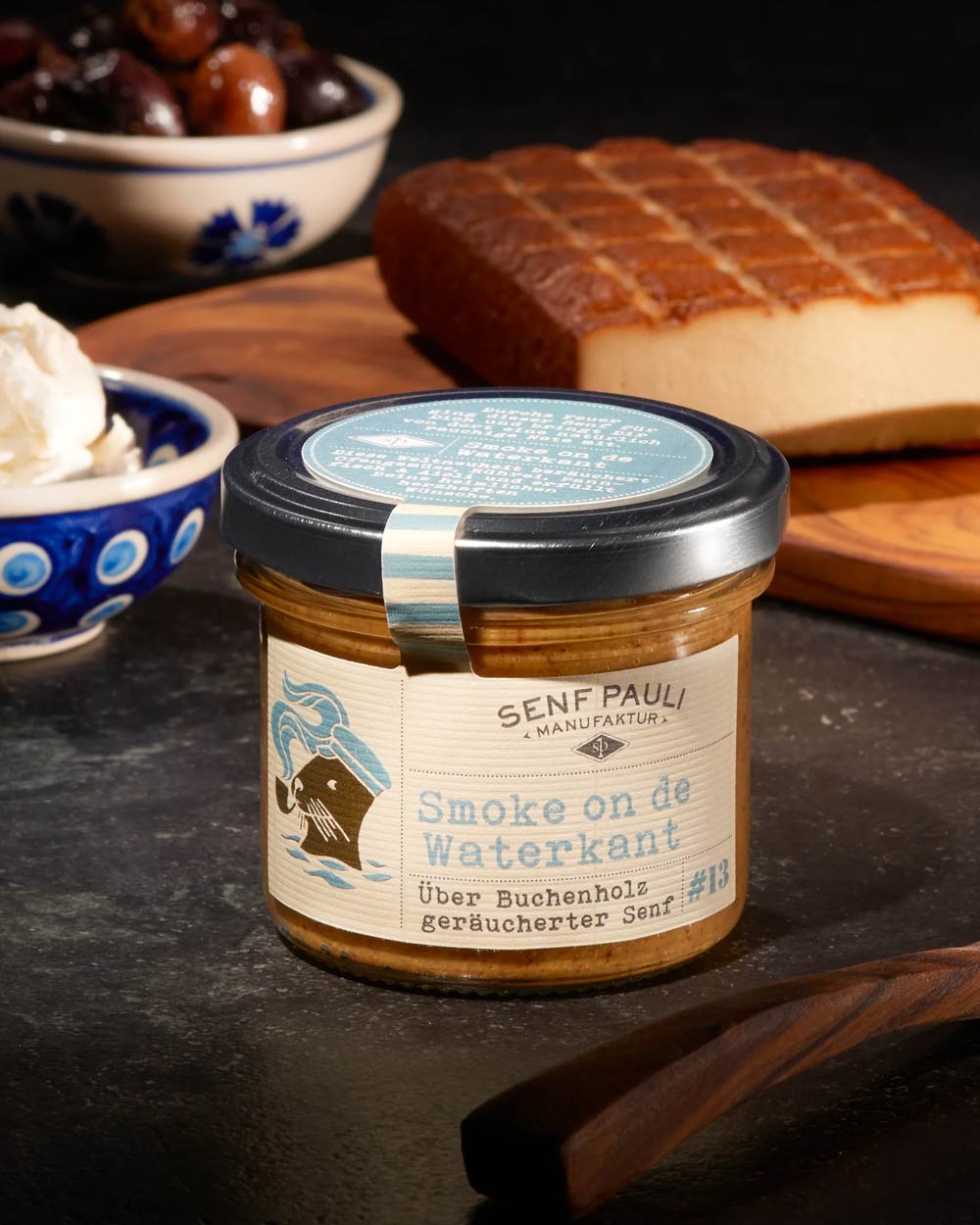 Der regionale Senf "Smoke on de Waterkant" mit natürlicher Rauchnote kommt direkt aus der Hamburger Manufaktur Senf Pauli.