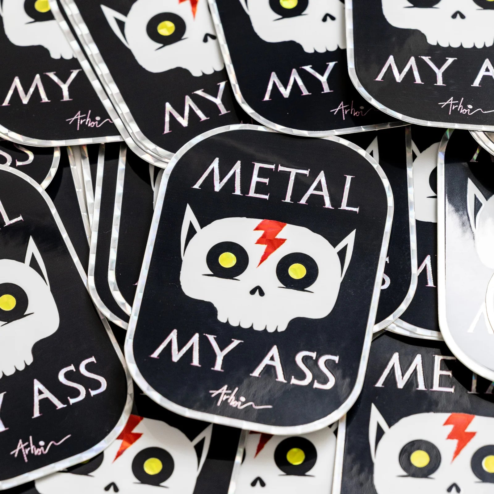 Mit dem Sticker "Metal My Ass" wird dein Laptop wird nie wieder langweilig sein. Deine Wasserflasche bekommt endlich den Glanz, den sie verdient. Dein Terminplaner wird strahlen. Und Dein Skateboard? GLAM IT UP. Die Aufkleber sind in einer Vielzahl von Stilen und Designs erhältlich (u. a. holografisch, holografisch glitzernd, gebürsteter Aluminium-Look)
