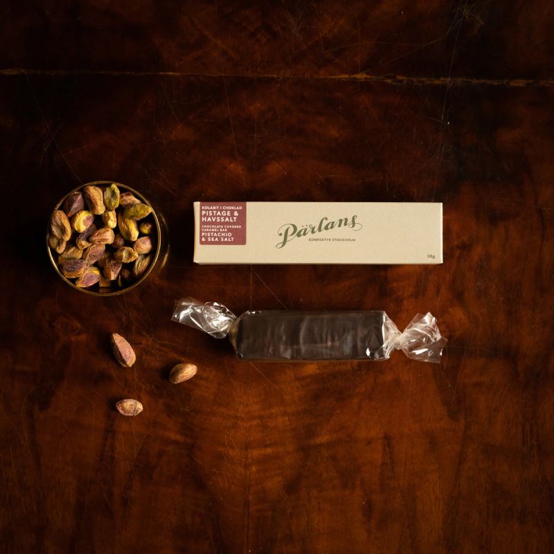 Der große, von Hand gewickelte und in köstliche Zartbitterschokolade getauchte Karamellriegel ist die perfekte Kombination aus knusprig und cremig und stammt aus der schwedischen Konditorei Pärlans. Ein köstlich zarter Karamellriegel mit gerösteten Pistazienstückchen, einem Hauch von Meersalz und einer feinen Schicht dunkler Schokolade.