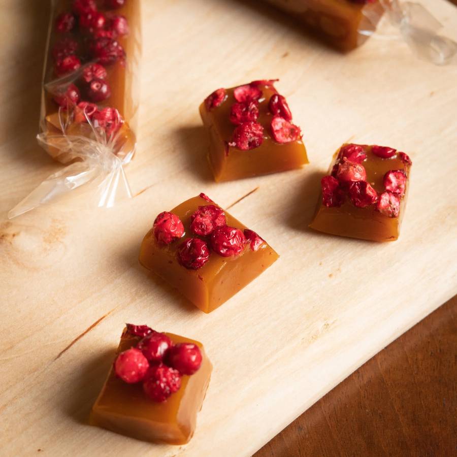 - ZUTATEN: Zucker, Sahne, Glykosesirup, Butter, Safran, Preiselbeeren und Meersalz.