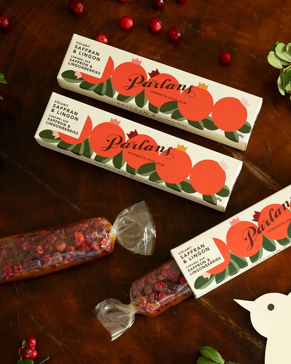 Der große, von Hand gewickelte und in Schokolade getauchte Karamellriegel ist gefüllt mit einer unschlagbaren Kombination aus cremigem Safranpudding und säuerlichen roten Preiselbeeren und stammt aus der schwedischen Konditorei Pärlans.