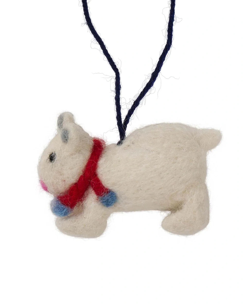 Supersweeter Filzanhänger in Form eines kleinen Eisbären vom schwedischen Label Klippan Yllefabrik. Er besteht zu 100 % aus handgefilzter Wolle und wurde von Bengt & Lotta entworfen. Perfekt zum Aufhängen im Kinderzimmer oder am Weihnachtsbaum.