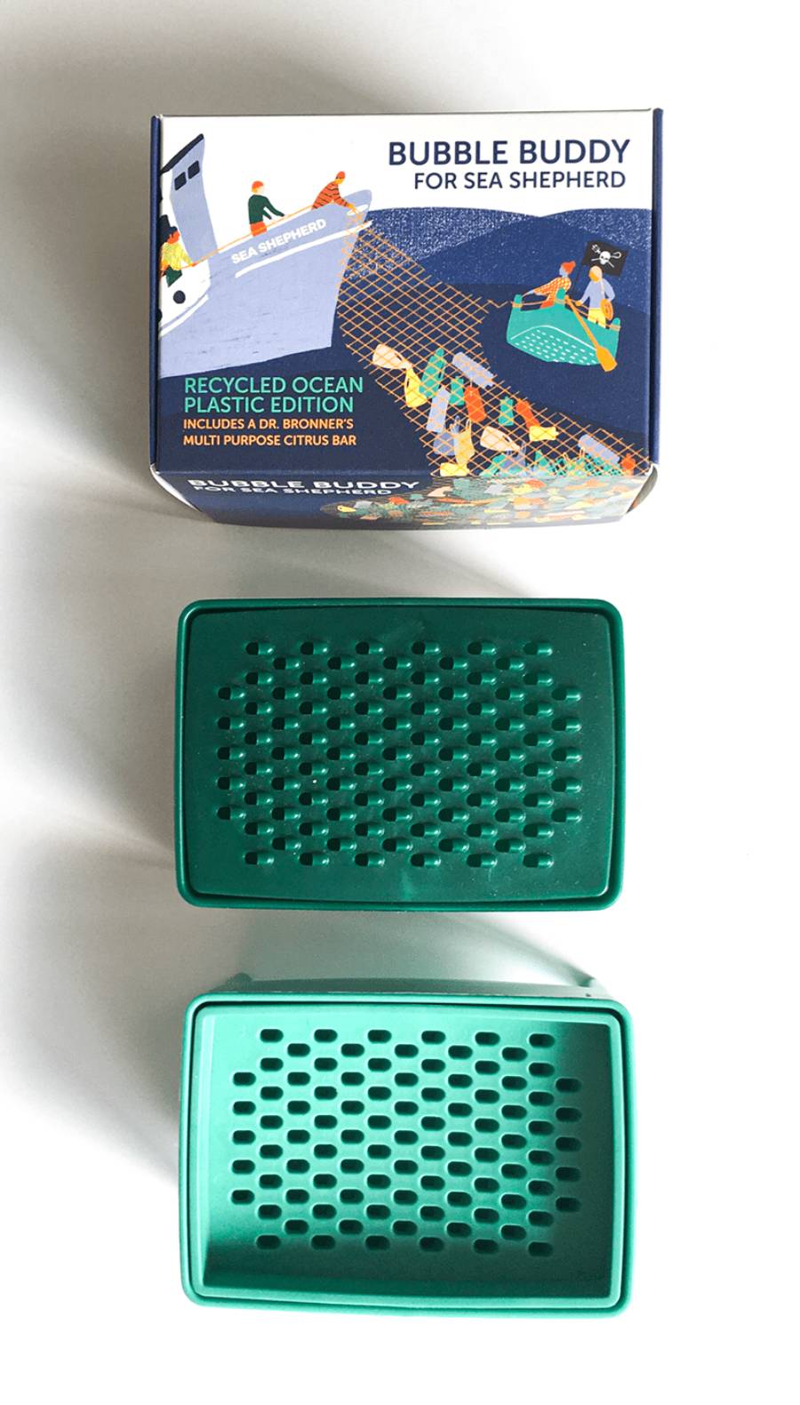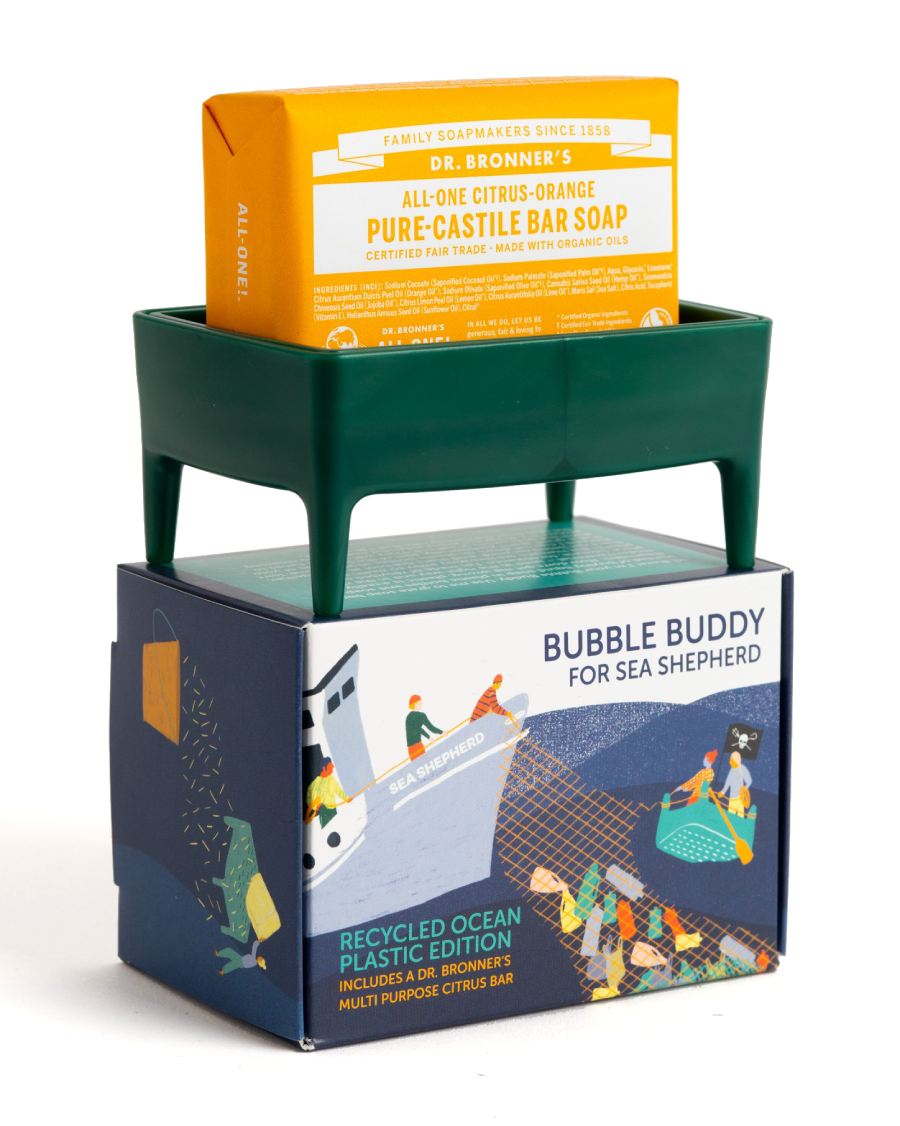 Die "Recycled Ocean Plastic Limited Edition" der guten Bubble Buddy-Seifenablagen - inklusive einer All-In-One Citrus-Orange-Seife von Dr. Bronner's.