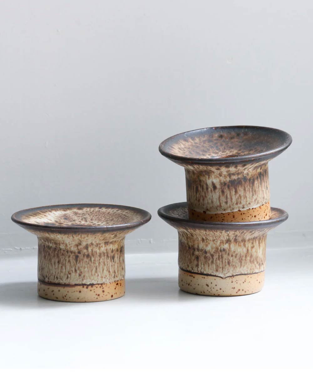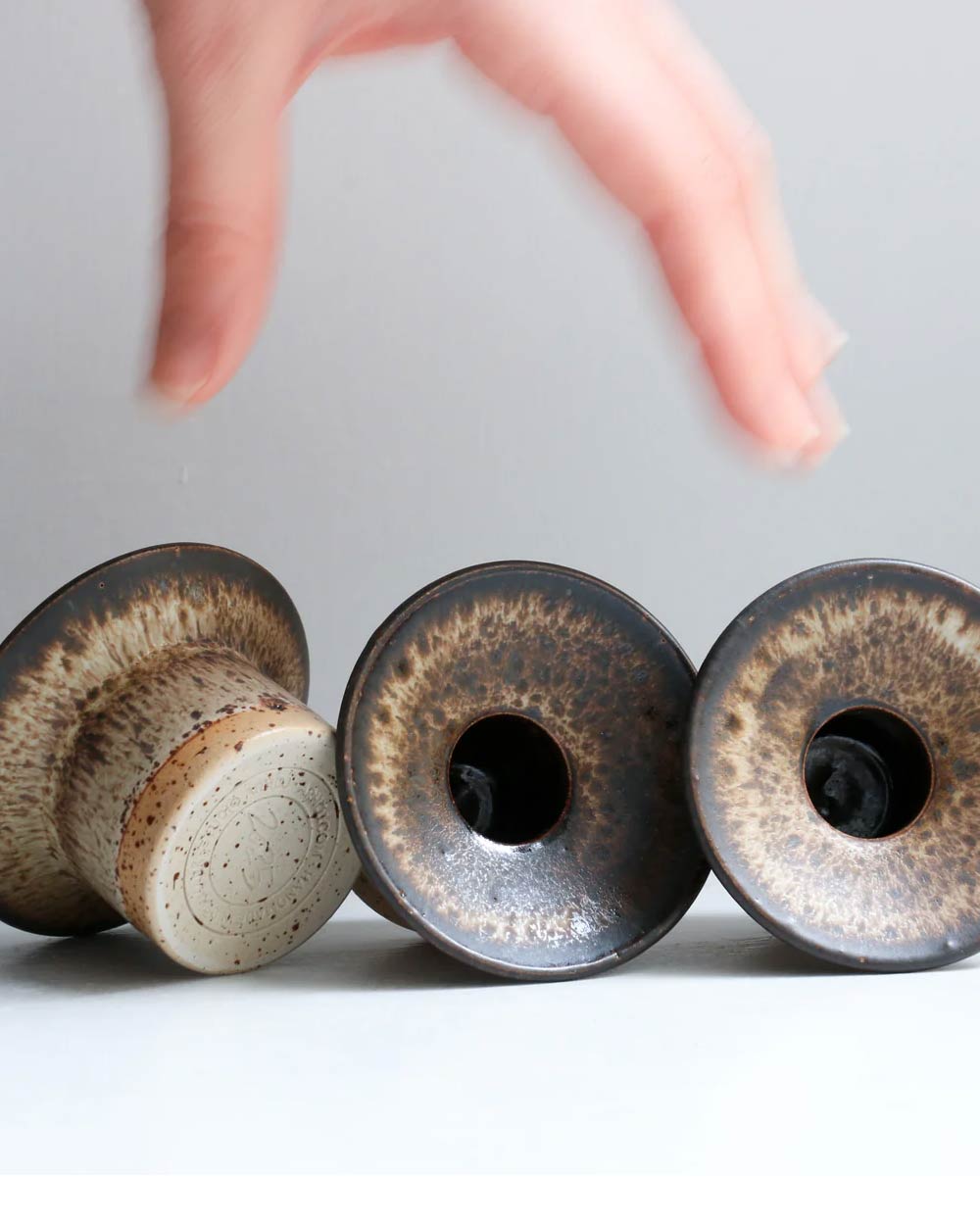 Die leichte Biegung ermöglicht es den Glasuren, beim Brennen sanft nach unten zu gleiten, wodurch ein schöner Ringeffekt entsteht. Der schwere Fuß sorgt dafür, dass deine Kerze sicher und stabil steht. Wie bei den anderen handgefertigten Artikeln von Studio Arhoj gleicht kein Exemplar dem anderen.