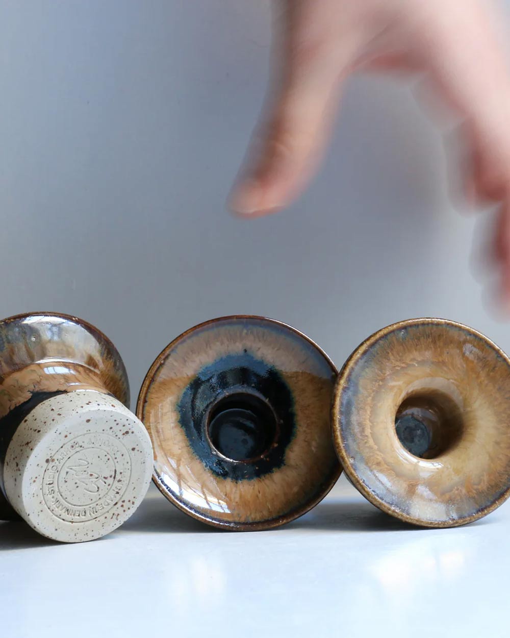 • Drei Hono Root Beer Kerzenständer von Studio Arhoj; handgefertigte, glasierte Keramik mit unglasiertem Boden und Herstellermarke, ein Hand arrangiert einen Kerzenhalter.