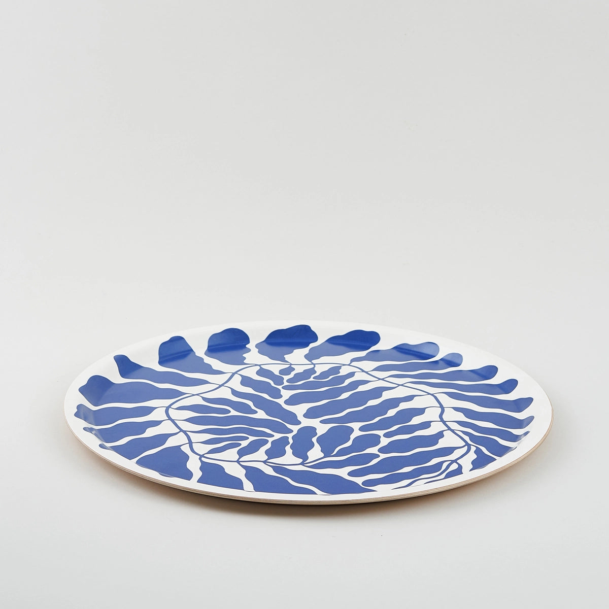 Rundes Tablett mit dem Leaves Motiv in blau, gestaltet von Linnea Andersson für das britische Label Wrap.
