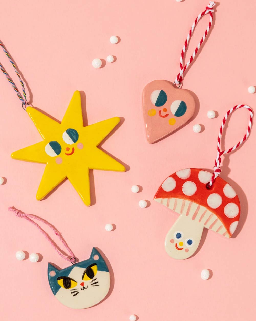 Hergestellt aus Keramik-Steingut, handbemalt und mit einer Schicht transparenter Glanzglasur für einen glänzenden Look versehen. Von Ana Seixas. Diese Dekoration wird mit einer bunten Schnur zum Aufhängen geliefert.