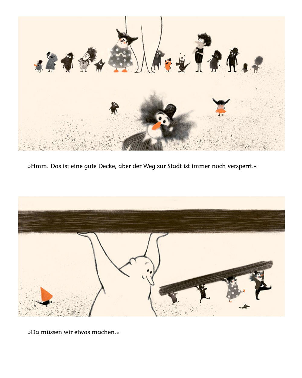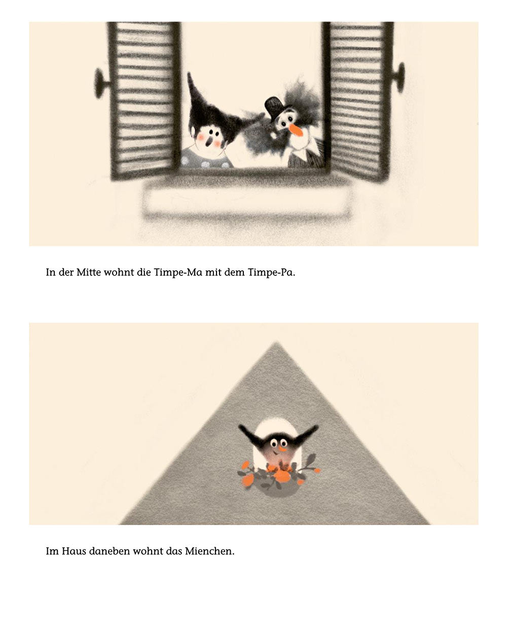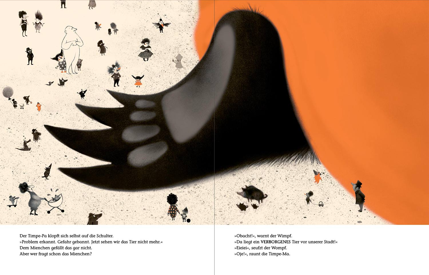 Oh nein, vor der Stadt liegt ein riesiges Tier! Es versperrt den Weg. Eieiei, tönt der Wompf. Oje, stöhnt die Timpe-Ma. Da muss etwas gemacht werden! Und dann machen sie etwas. Sie decken das Tier zu, bauen eine Brücke drüber und eine Straße drum herum. Problem erkannt, Problem gebannt! Nur das Mienchen schüttelt den Kopf, ihm gefällt das gar nicht. Aber wer hört schon auf Mienchen? Da nimmt es sich ein Herz und spricht das Tier einfach an …